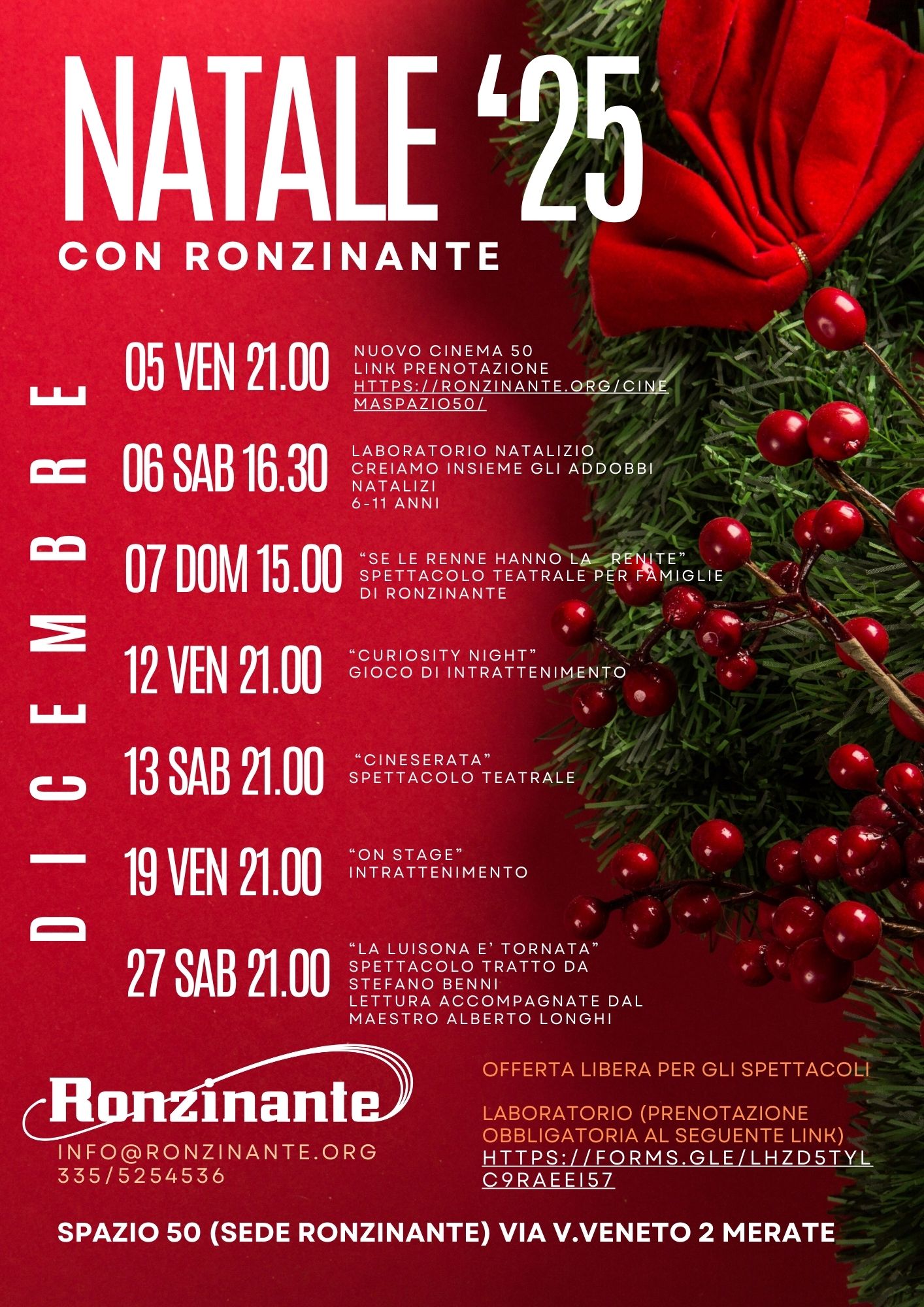 Si prospetta un periodo pre e post natalizio molto intenso e ricco di eventi allo Spazio 50 a Merate, sede di Ronzinante, il sodalizio teatrale che opera da oltre vent’anni sul territorio.