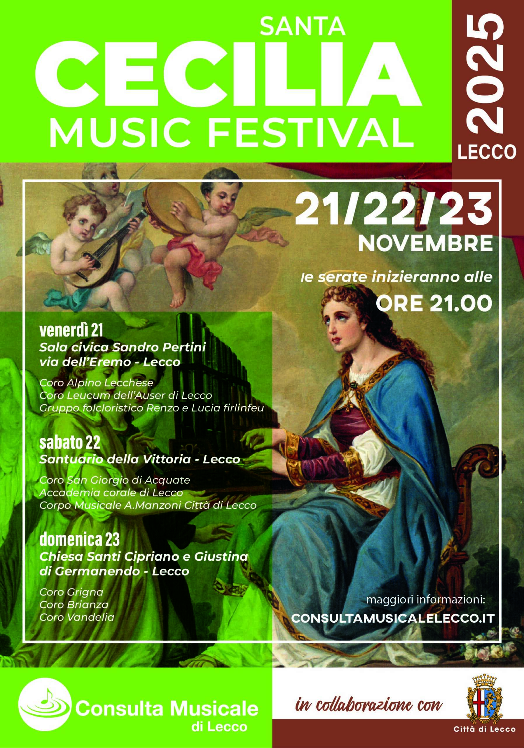 - Sabato 22 Novembre alle 21.00 presso il Santuario Nostra Signora della Vittoria si terrà il concerto Strumenti e voci per Santa Cecilia. Corpo Musicale Alessandro Manzoni – Direttore: Davide Spreafico Accademia Corale di Lecco – Direttore: Antonio Scaioli Coro San Giorgio di Acquate – Direttore: Gianmarco Aondio