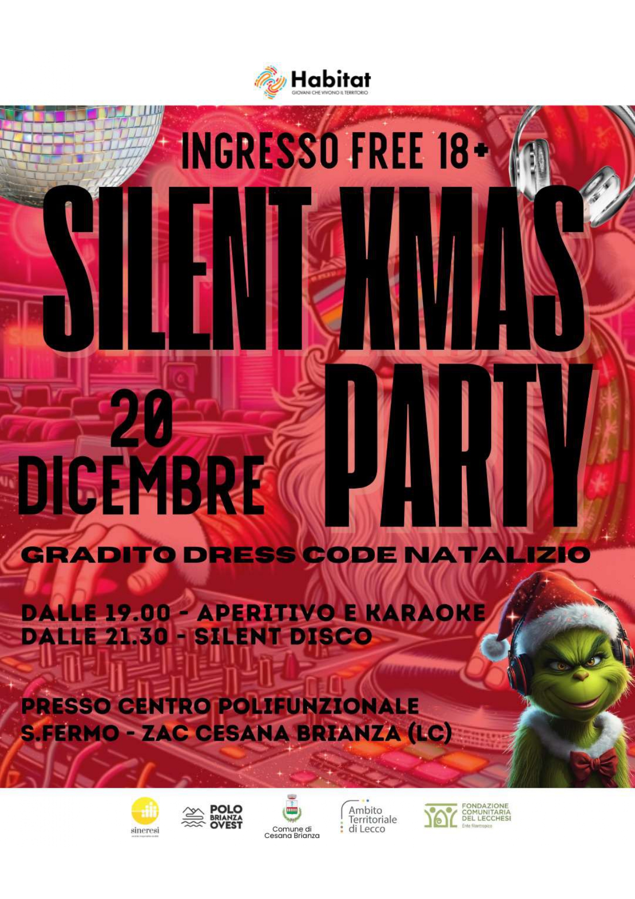 I giovani del progetto Habitat NEXT presentano Silent Xmas party, un evento scintillante per dare il via alle festività natalizie all’insegna della musica e del divertimento. L’appuntamento è per Sabato 20 Dicembre presso il Centro Polifunzionale San Fermo di Cesana Brianza. La serata prenderà il via alle 19.00 con un aperitivo accompagnato da karaoke; a partire dalle 21.30 spazio al divertimento con la Silent Disco Party, animata da un dj set dal vivo.