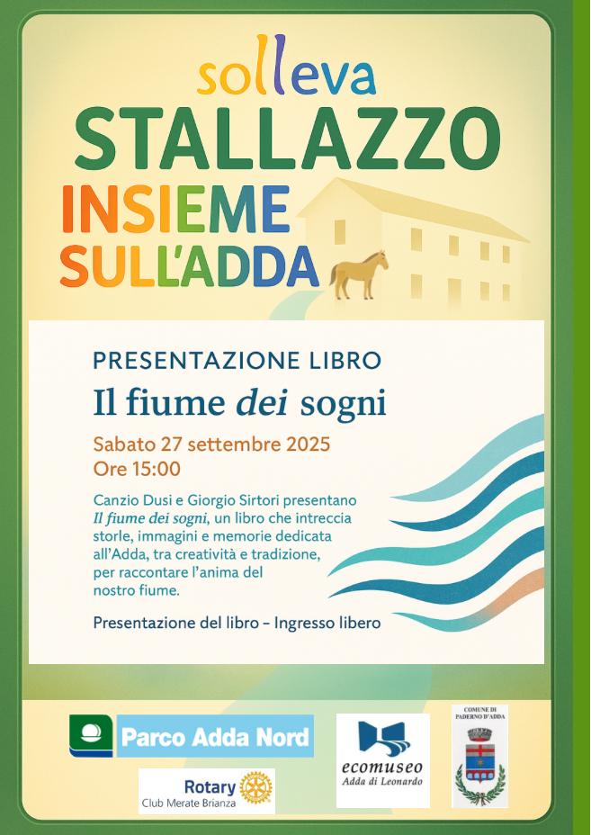Sabato 27 Settembre, alle 15.00 gli autori Canzio Dusi e Giorgio Sirtori presenteranno, a Stallazzo, a Paderno d’Adda, il libro Il fiume dei sogni. L’opera intreccia storie, immagini e memorie dedicatae all’Adda, e racconta l’anima del fiume attraverso creatività e tradizione.