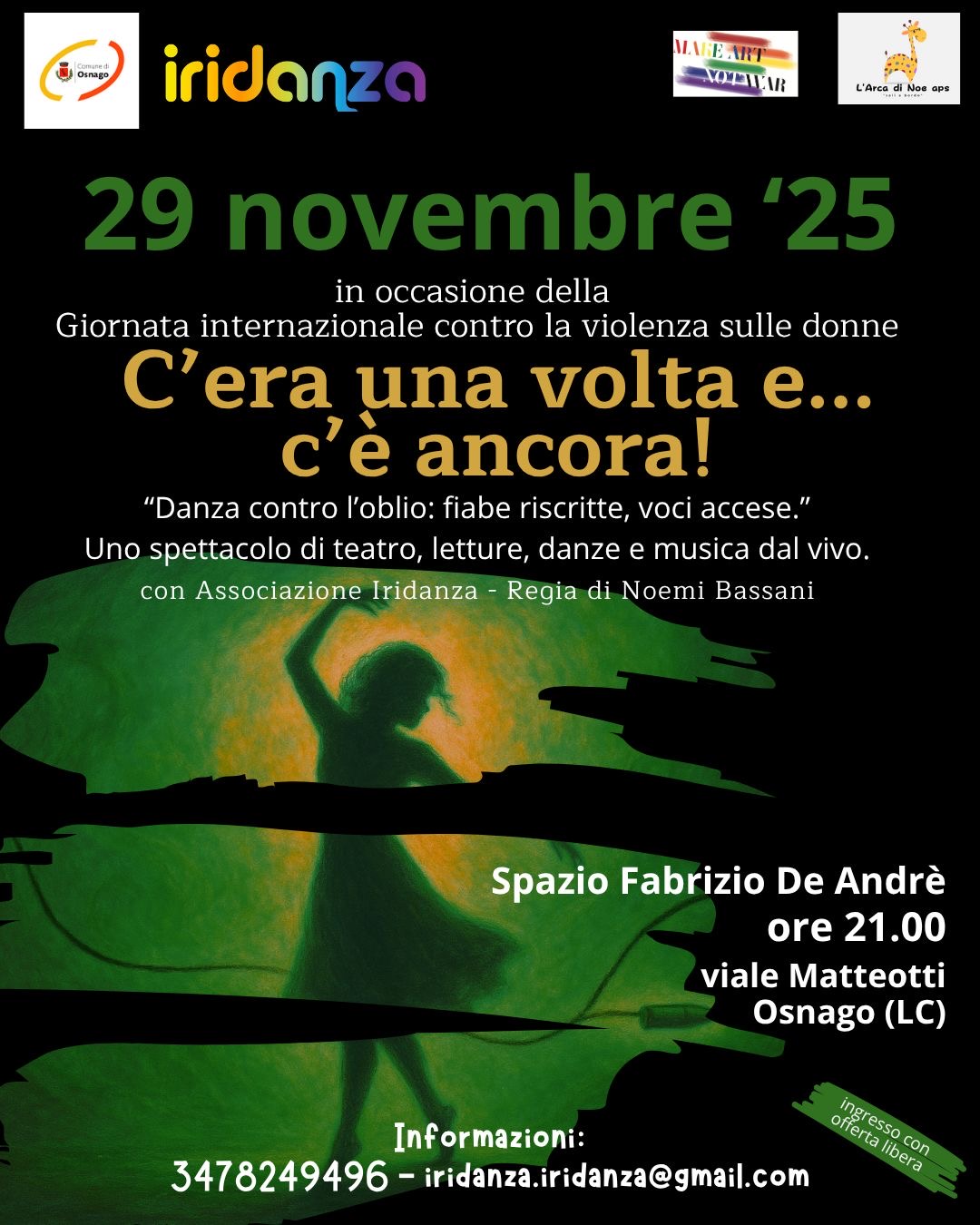 Sabato 29 novembre, alle 21.00, lo Spazio Fabrizio De Andrè di Osnago, ospiterà lo spettacolo Cera una volta… e c’è ancora! Danza contro l’oblio: fiabe riscritte, voci accese. uno spettacolo di Teatro, Letture, Danze e Musica dal vivo.