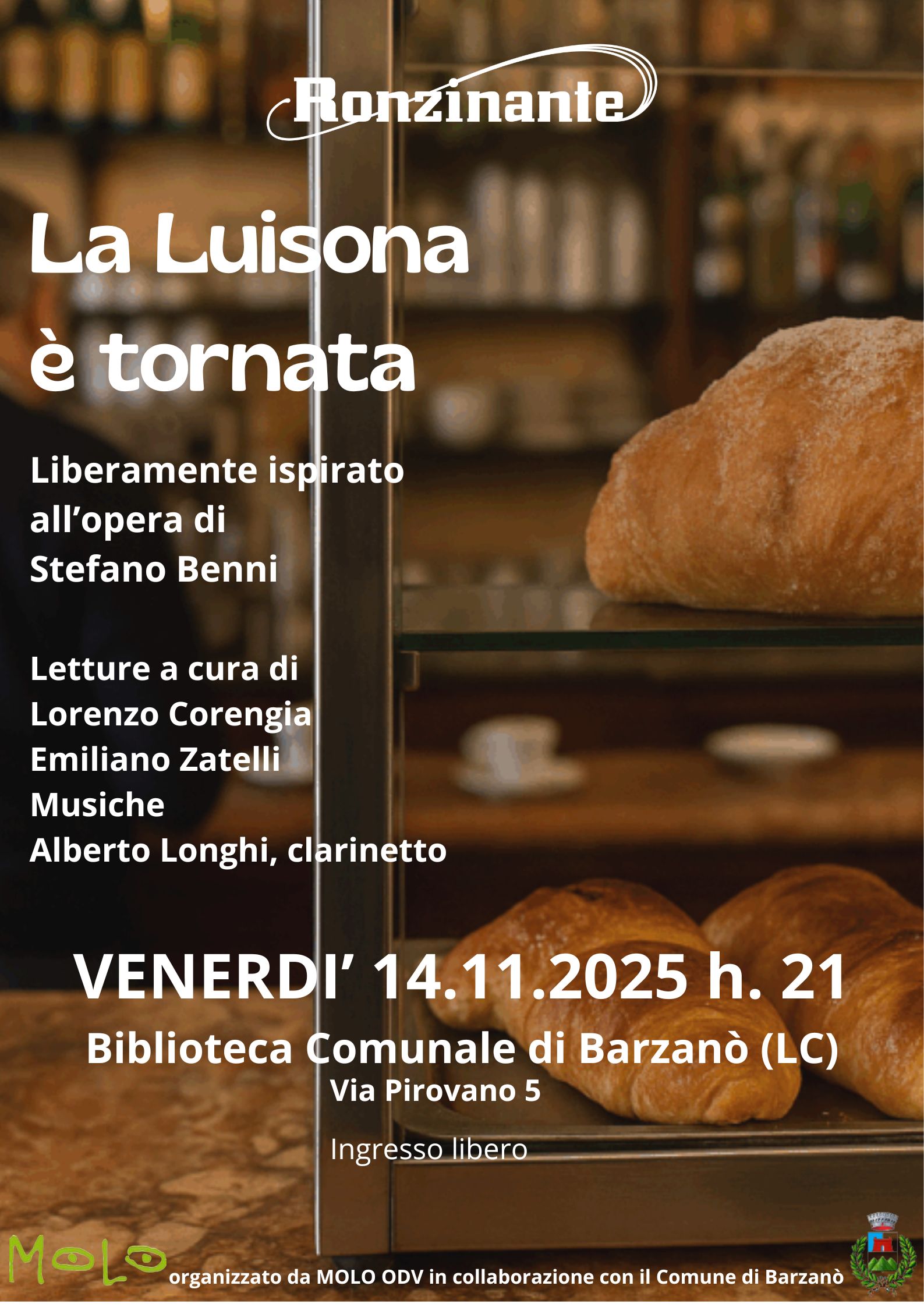 Associazione Molo e Ronzinante Teatro, in collaborazione con la Commissione Cultura del Comune di Barzanò, organizzano lo spettacolo La Luisona è tornata. L’opera è in programma per Venerdì 14 Novembre alle 21.00 presso la Biblioteca di Barzanò. Ingresso libero senza prenotazione.
