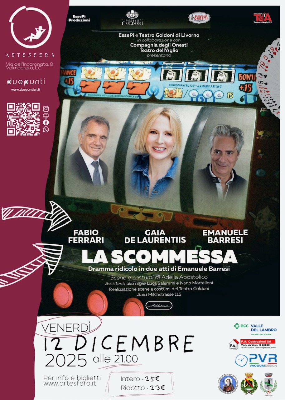 Venerdì 12 Dicembre alle 21.00 arriva a Valmadrera, sul palcoscenico del Teatro Artesfera, lo spettacolo La Scommessa, interpretato da Gaia De Laurentiis, Fabio Ferrari ed Emanuele Barresi, con la regia di Enrico Maria Lamanna.