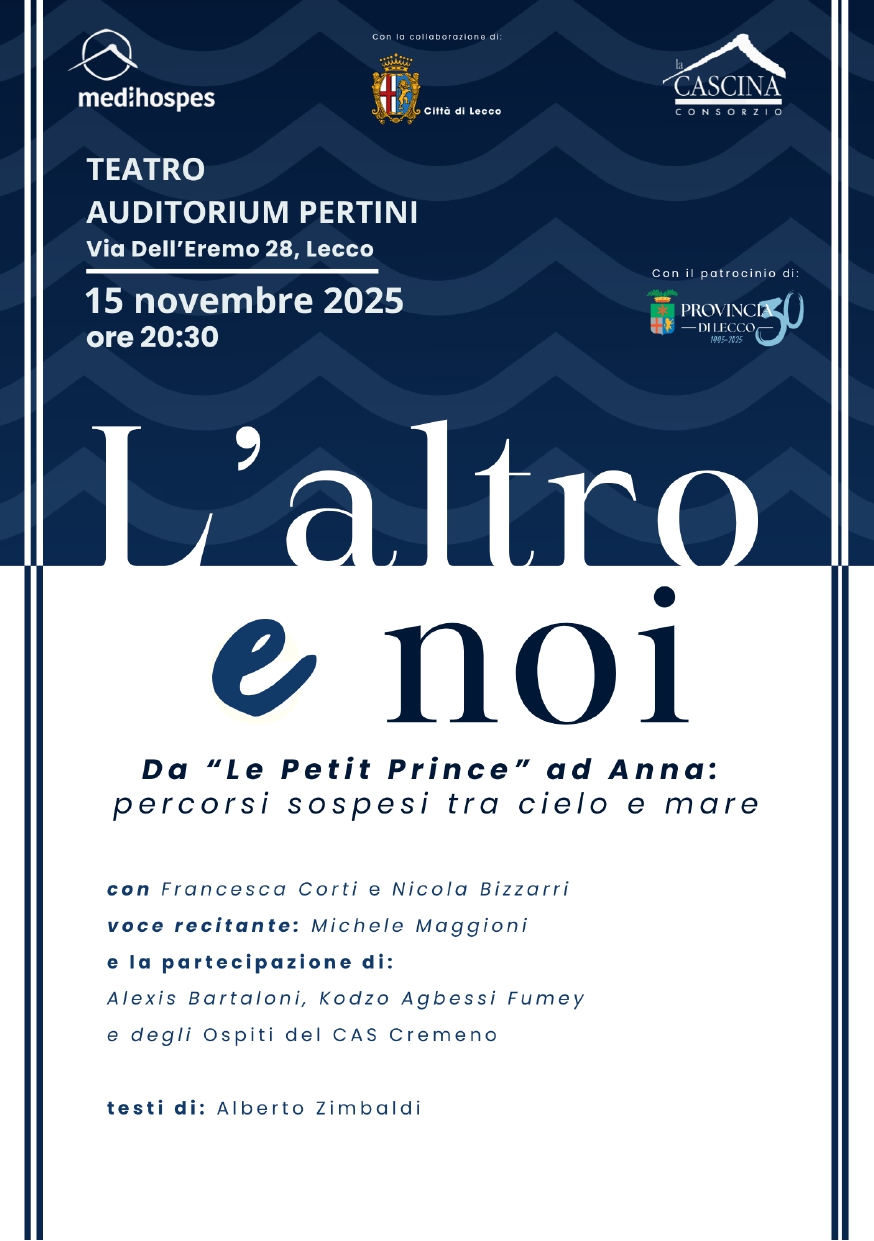 Sabato 15 Novembre, al teatro auditorium Pertini di Lecco, alle 20.30 andrà in scena la rappresentazione teatrale L’altro e noi di Alberto Zimbaldi. La serata, gratuita, porta insieme sul palco attori di un’importante compagnia teatrale del territorio lecchese e migranti accolti nel Cas di Cremeno gestito dalla cooperativa sociale Medihospes