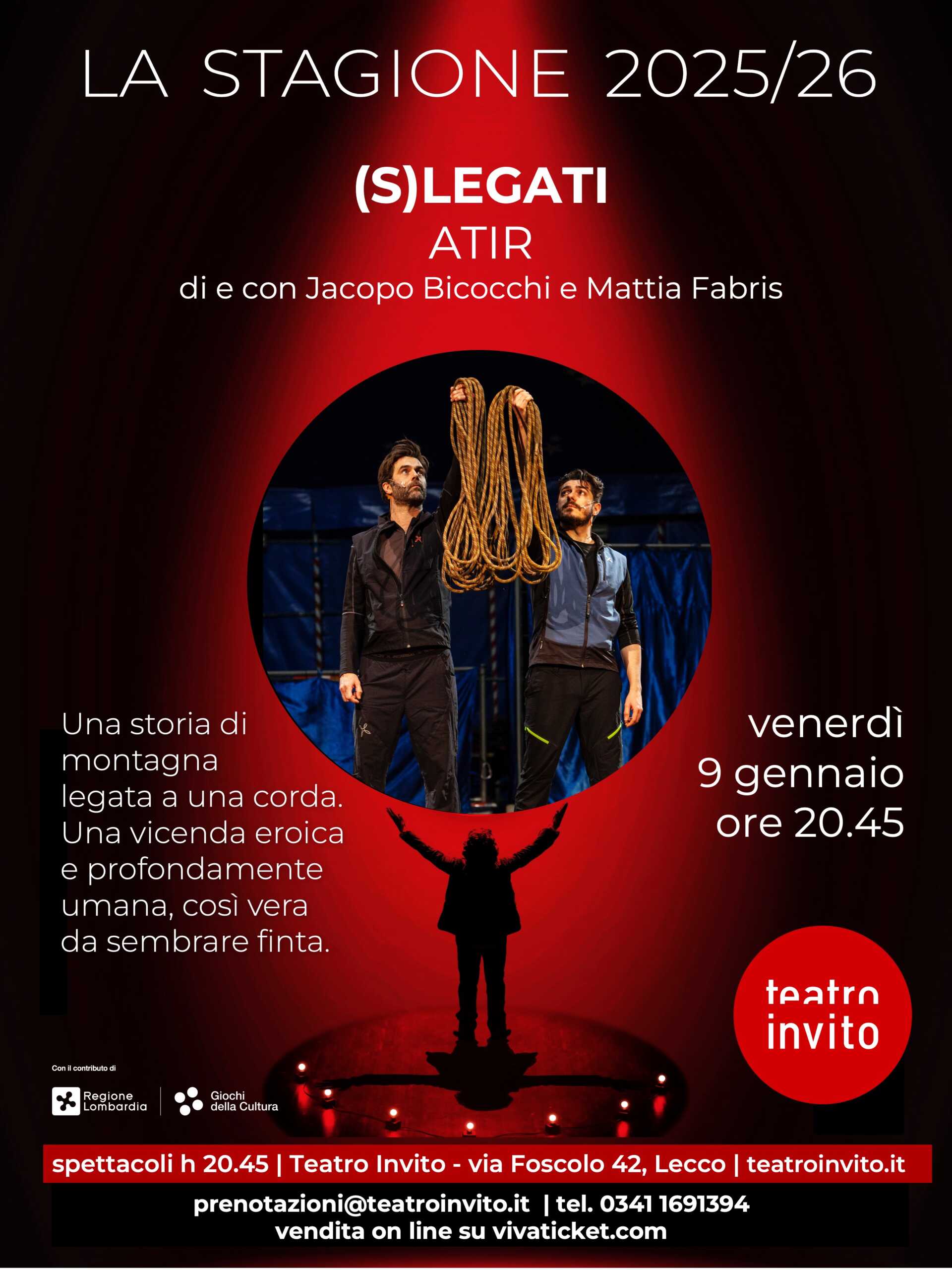 Venerdì 9 Gennaio, alle 20.45, Spazio Teatro Invito a Lecco ospiterà lo spettacolo (S)legati, di e con Jacopo Bicocchi e Mattia Fabris. Il biglietto intero costa 15 euro, mentre il ridotto 12 euro. Per chi ha meno di 30 anni l’ingresso è 9 euro.
