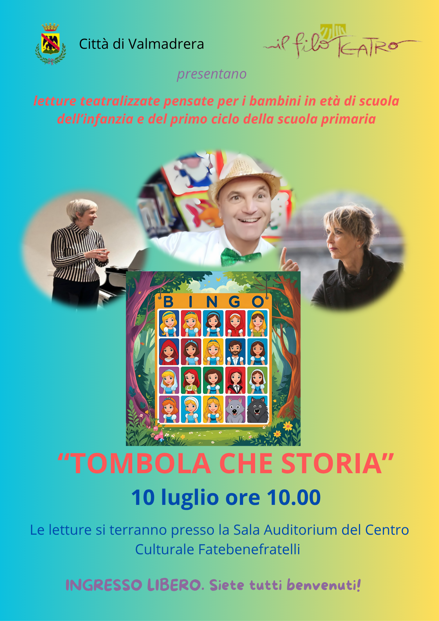 Giovedì 10 Luglio, alle 10.00, presso la Sala Auditorium del Centro Culturale Fatebenefratelli si terrà “Tombola che storia“. L’evento prevede un tabellone con 16 caselle rappresentanti i personaggi delle favole, un sacchetto con all’interno le figurine dei personaggi. Ogni volta che si pesca una figura si solleva la casella corrispondente, e si legge una delle storie (classica, musicale, in rima…). Finito di ascoltare la fiaba, i bambini devono indovinare il genere e, il libro appena ascoltato, verrà posizionato sulla cartella. Se alla fine del gioco i libri sono posizionati sul genere giusto, si fa TOMBOLA. A gestire il tutto due brillanti conduttori-attori che non vedono l’ora di scoprire le caselle e le storie con il giovane pubblico.