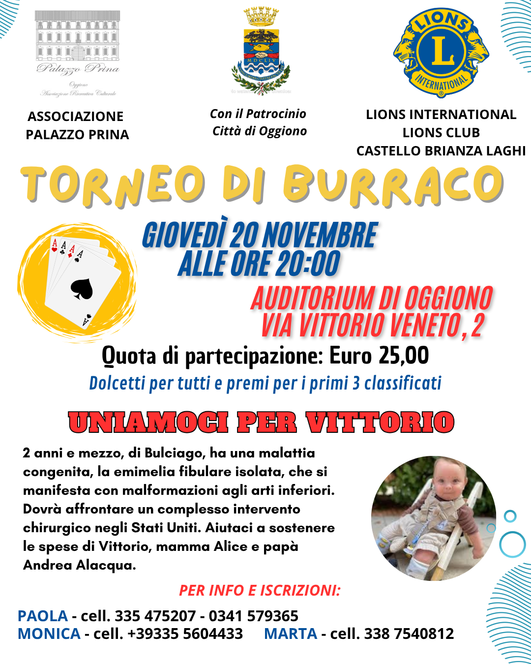 Lions Club Castello Brianza Laghi e l’Associazione Palazzo Prina con il patrocinio di Cittá di Oggiono, organizzano un torneo di “burraco solidale” giovedì 20 novembre alle 20.00 presso l’Auditorium di Oggiono in Via V. Veneto 2 per raccogliere fondi da donare al piccolo Vittorio Alacqua di Bulciago, affetto da emimelia fibulare isolata, malformazione congenita degli arti inferiori.