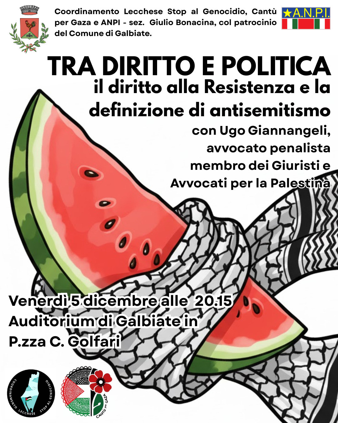 Il Coordinamento lecchese stop al genocidio insieme a Cantù per Gaza, ANPI-sezione Giulio Bonacina col patrocinio del comune di Galbiate, organizzano un incontro pubblico dedicato al rapporto tra diritto internazionale e dinamiche politiche contemporanee, con particolare attenzione ai temi del diritto alla resistenza e alle definizioni giuridiche di antisemitismo e antisionismo.
