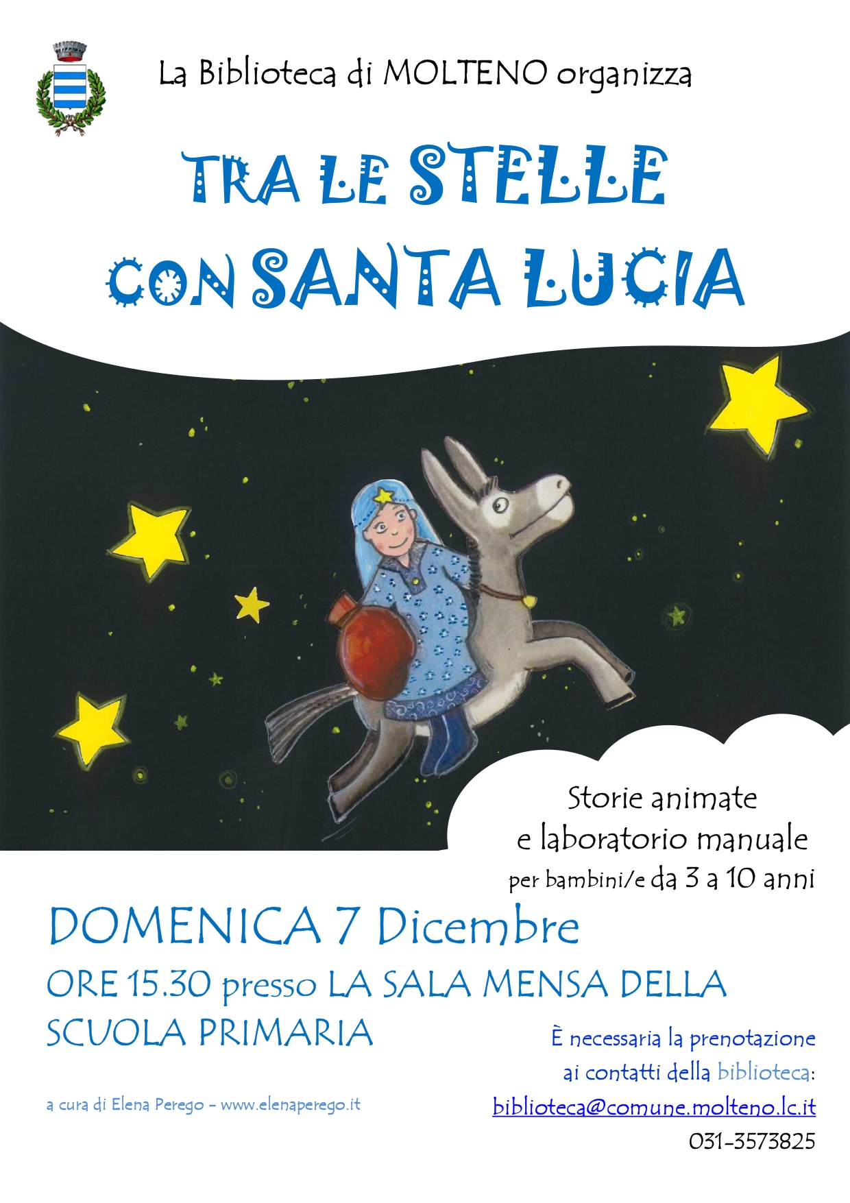 Nell’ambito della giornata dedicata ai Mercatini Natalizi, l’Amministrazione Comunale di Molteno propone Tra le stelle con Santa Lucia, storie animate e laboratorio manuale a cura di Elena Perego, dedicati ai bambini dai 3 ai 10 anni circa.