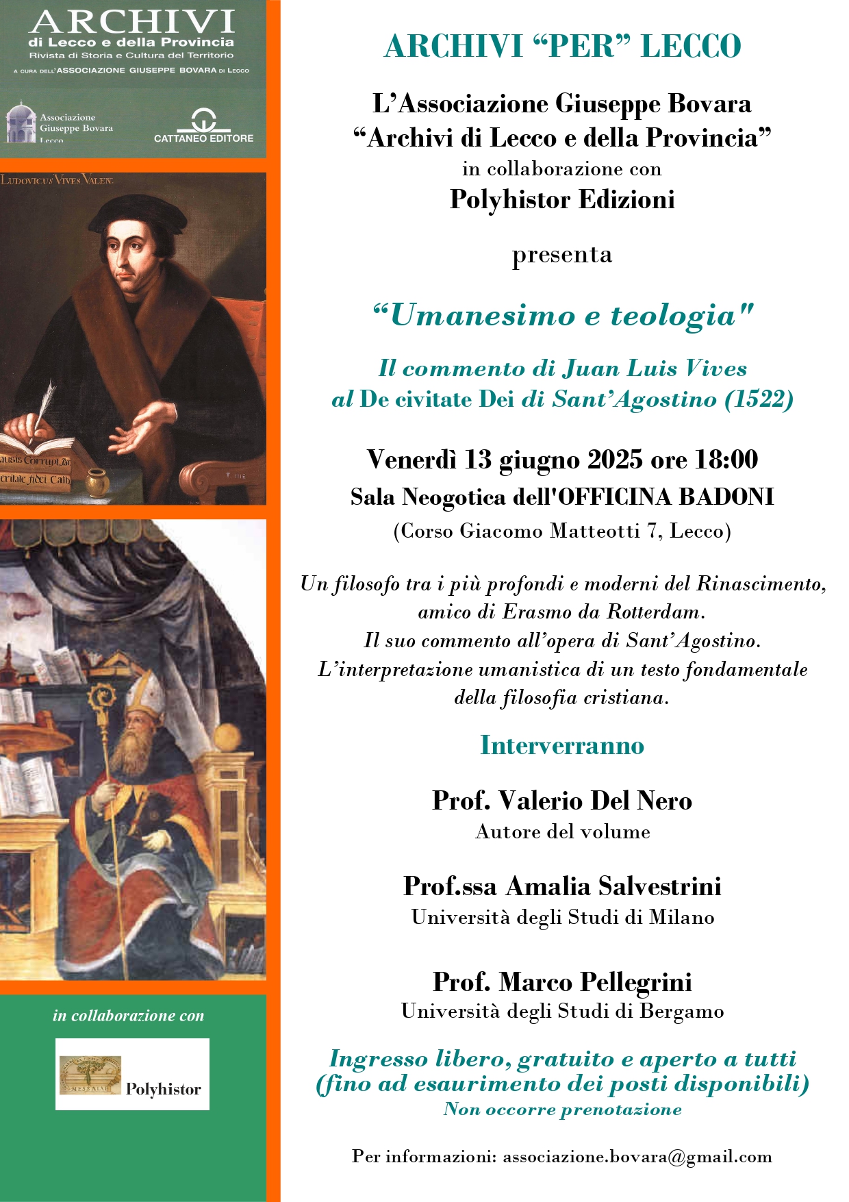 L’Associazione Giuseppe Bovara – “Archivi di Lecco e della Provincia” in collaborazione con Polyhistor edizioni presenta “Umanesimo e teologia – Il commento di Juan Luis Vives al De civitate Dei di Sant’Agostino“. L’incontro è previsto per Venerdì 13 giugno alle 18:00 presso la Sala Neogotica dell’Officina Badoni. L’ingresso è libero e gratuito.