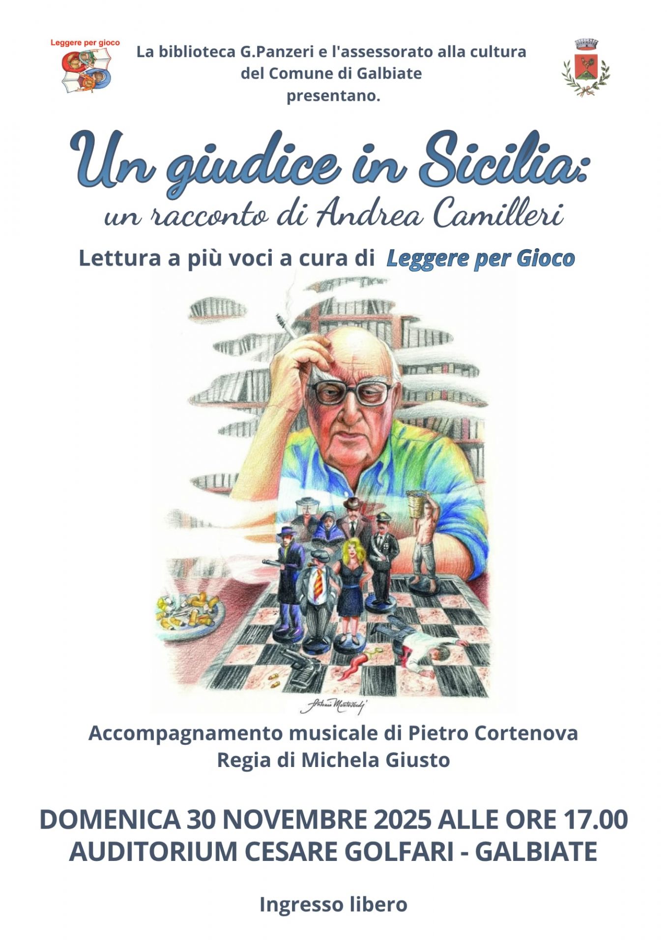 In occasione dei 100 anni dalla nascita di Andrea Camilleri, la biblioteca “Giuseppe Panzeri” e l’Assessorato alla cultura del Comune di Galbiate presentano Un Giudice in Sicilia, una lettura a più voci a cura di Leggere per gioco del racconto di Andrea Camilleri. La lettura sarà accompagnata dalla musica di Pietro Cortenova e l’intera serata sarà diretta da Michela Giusto. L’appuntamento, a ingresso gratuito, è per Domenica 30 Novembre alle 17.00, presso l’Auditorium “Cesare Golfari” a Galbiate.