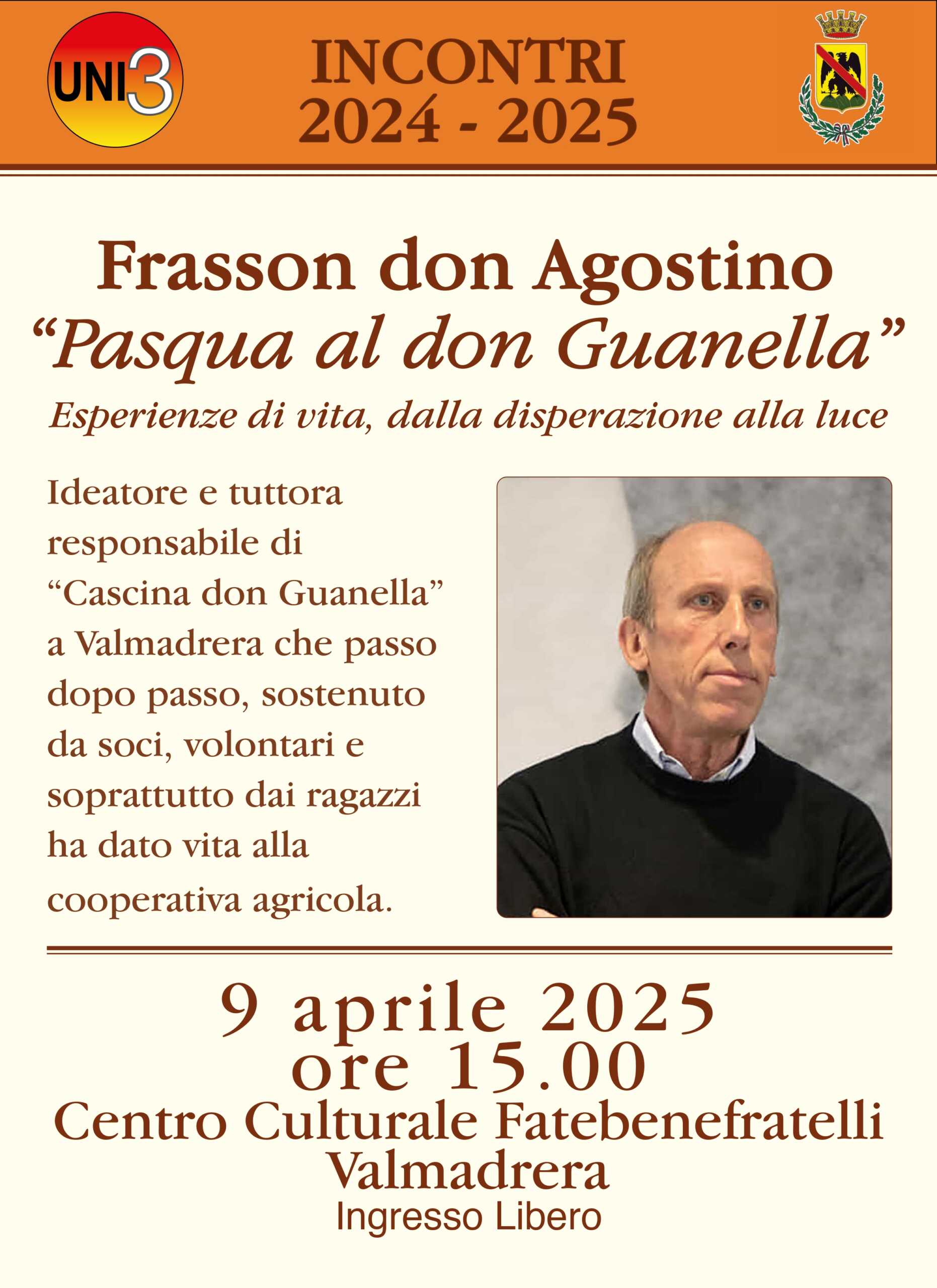 L’Amministrazione Comunale di Valmadrera propone il dodicesimo incontro dell’edizione 2024-2025 di “UNI3” Università della Terza Età, “Pasqua al Don Guanella. Esperienza di vita, dalla disperazione alla luce”, con Agostino Frasson. L’incontro si terrà mercoledì 9 aprile, alle 15.00, presso la Sala Auditorium del Centro Culturale Fatebenefratelli di Valmadrera.
