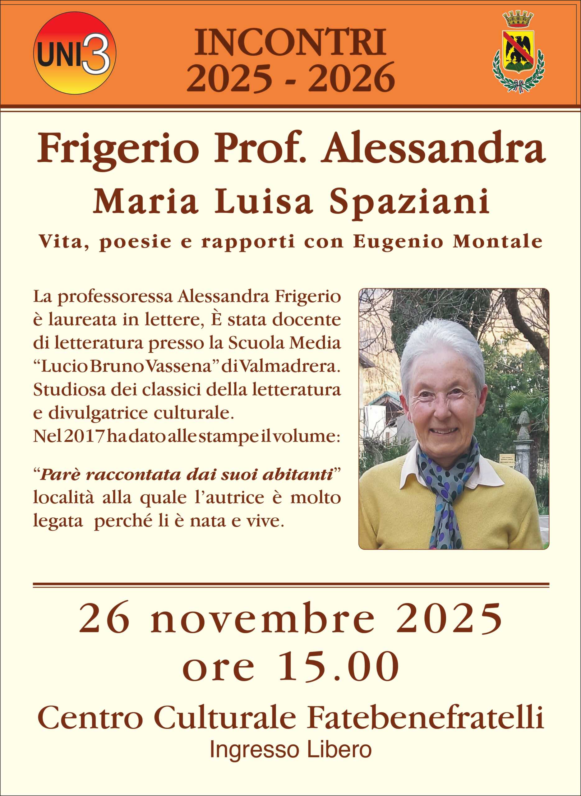 L’Amministrazione Comunale di Valmadrera propone il quarto incontro dell’edizione 2025-2026 di UNI3 Università della Terza Età. L’incontro si terrà Mercoledì 26 Novembre, alle 15.00, presso la sala Auditorium del Centro Culturale Fatebenefratelli di Valmadrera, e vedrà la Prof.ssa Alessandra Frigerio presentare Maria Luisa Spaziani. Vita, poesie e rapporti con Eugenio Montale.