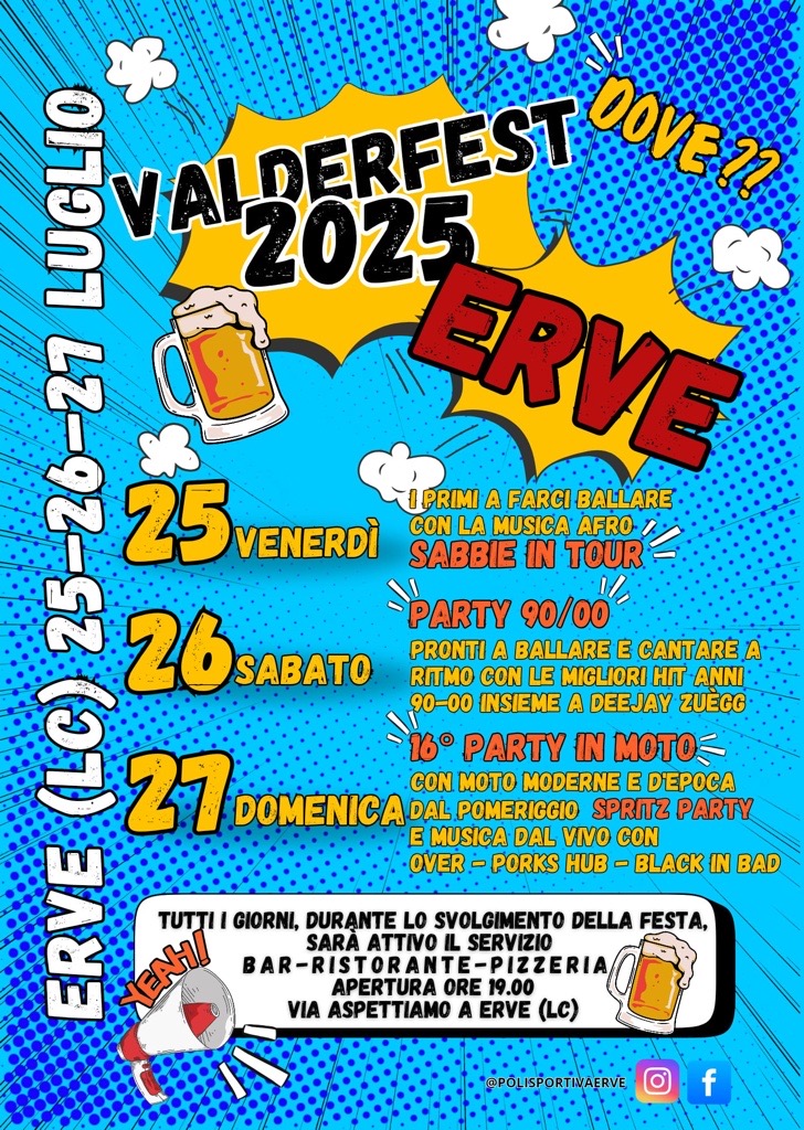Si svolgerà a Erve dal 25 al 27 Luglio il ValderFest, la tradizionale festa di paese con tanto di motoraduno all’interno della rassegna Erve ti aspetta 2025.