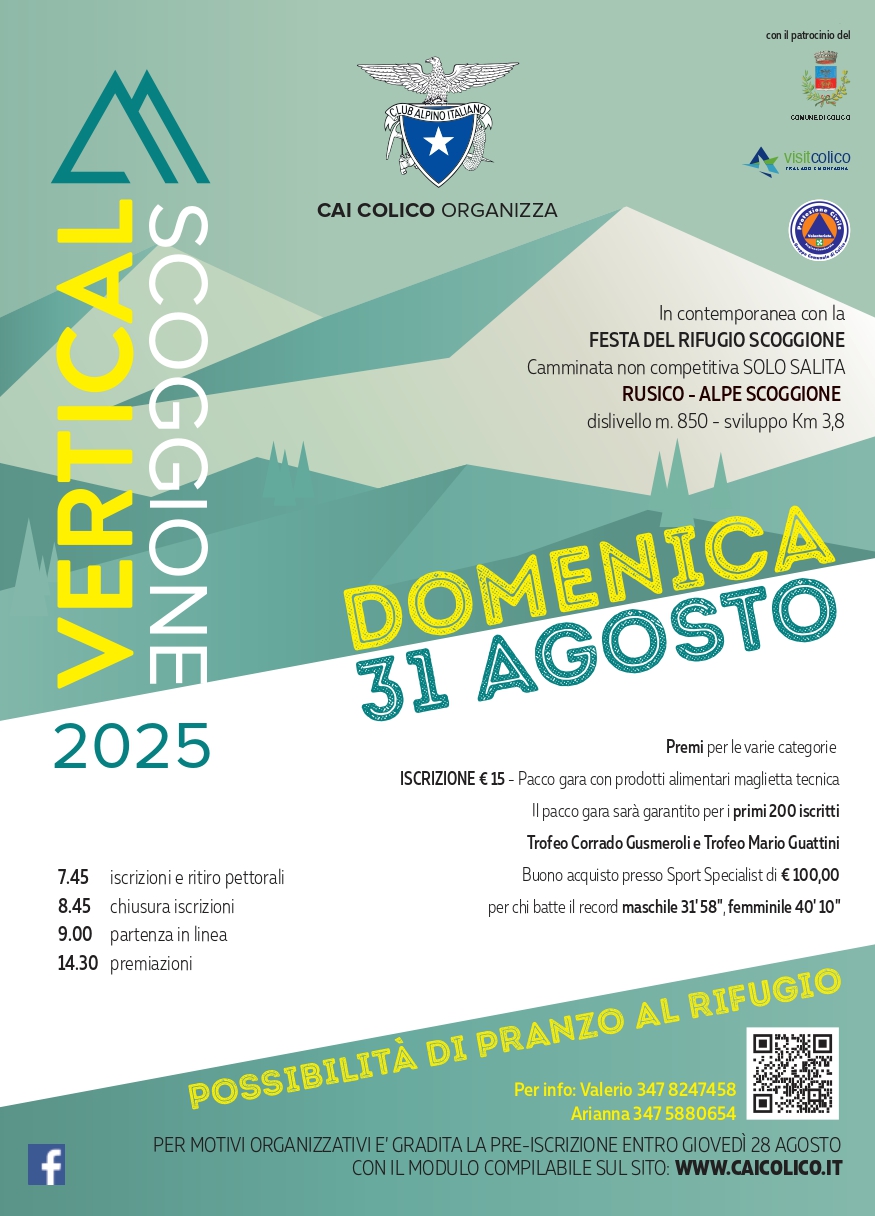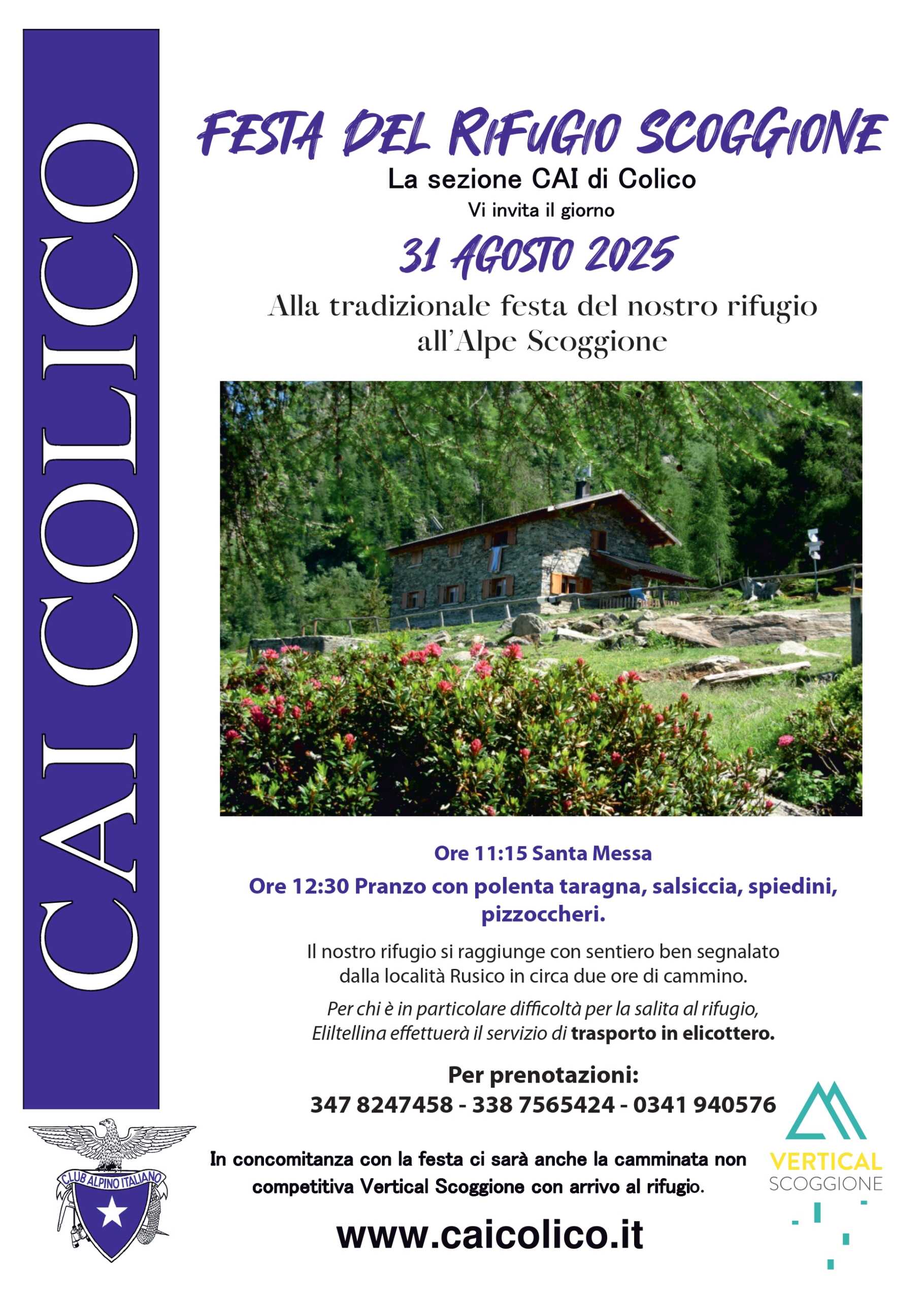 Domenica 31 Agosto verrà celebrata la IX festa del Rifugio Scoggione a cura del CAI di Colico. Il Club Alpino Italiano ha organizzato la Vertical Scoggione, una camminata non competitiva di sola salita dal Rusico all’Alpe Scoggione. Il percorso, lungo 3,8 km con dislivello di 850 metri, è completamente immerso nella natura. Le iscrizioni alla corsa, che inizierà alle 9.00, sono aperte dalle 7.45 alle 8.45 e costano 15 euro.