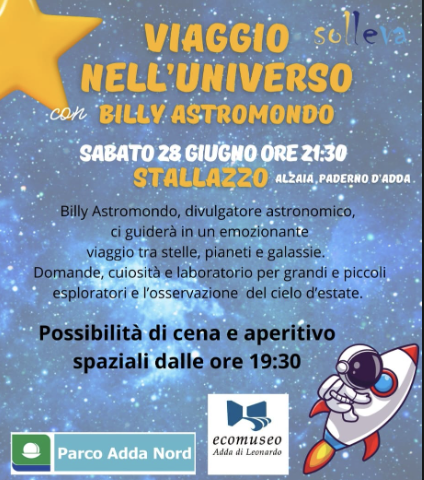 Sabato 28 Giugno alle 21.30 Paderno d’Adda guarderà interessata alla volta celeste grazie all’evento “Viaggio nell’universo con Billy Astromondo“. L’evento si terrà presso Stallazzo – Alzaia, a Paderno d’Adda e offrirà, per chi vuole, la possibilità di cena e aperitivo dalle 19.30, prenotabile via WhatsApp al 388 844 2167 indicando numero di partecipanti e orario. L’evento è gratuito e aperto a tutti.