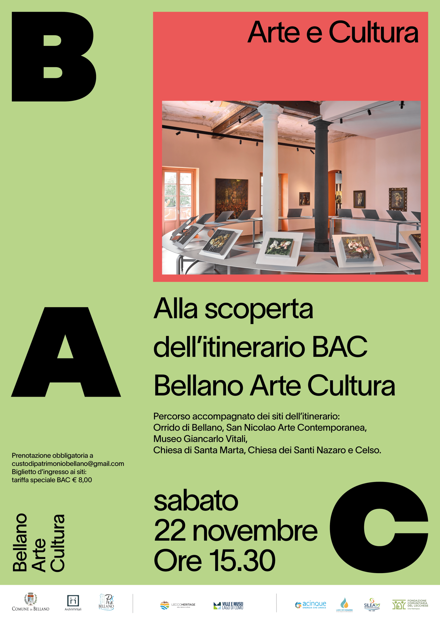 Sabato 22 Novembre alle 15.30, i custodi del Patrimonio di Bellano accompagneranno i visitatori nei siti dell’itinerario BAC Bellano Arte Cultura: Orrido di Bellano, San Nicolao Arte Contemporanea, Museo Giancarlo Vitali, Chiesa di Santa Marta, Chiesa dei Santi Nazaro e Celso.