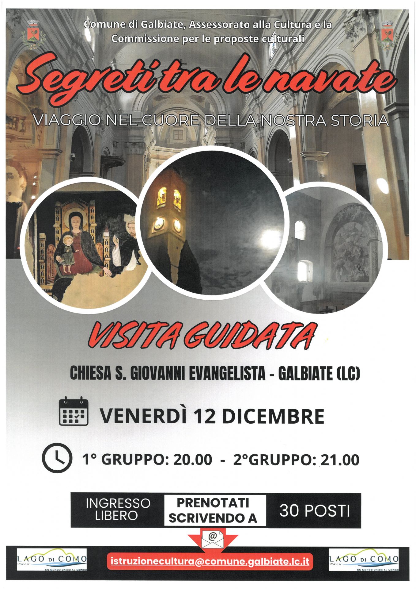 Considerato il notevole successo dell’iniziativa Segreti fra le navate – Viaggio nel cuore della nostra storia, Venerdì 12 Dicembre si terranno delle Visite Guidate presso la Chiesa di San Giovanni Evangelista di Galbiate. I partecipanti saranno divisi in due gruppi che partiranno rispettivamente alle 20.00 e alle 21.00.