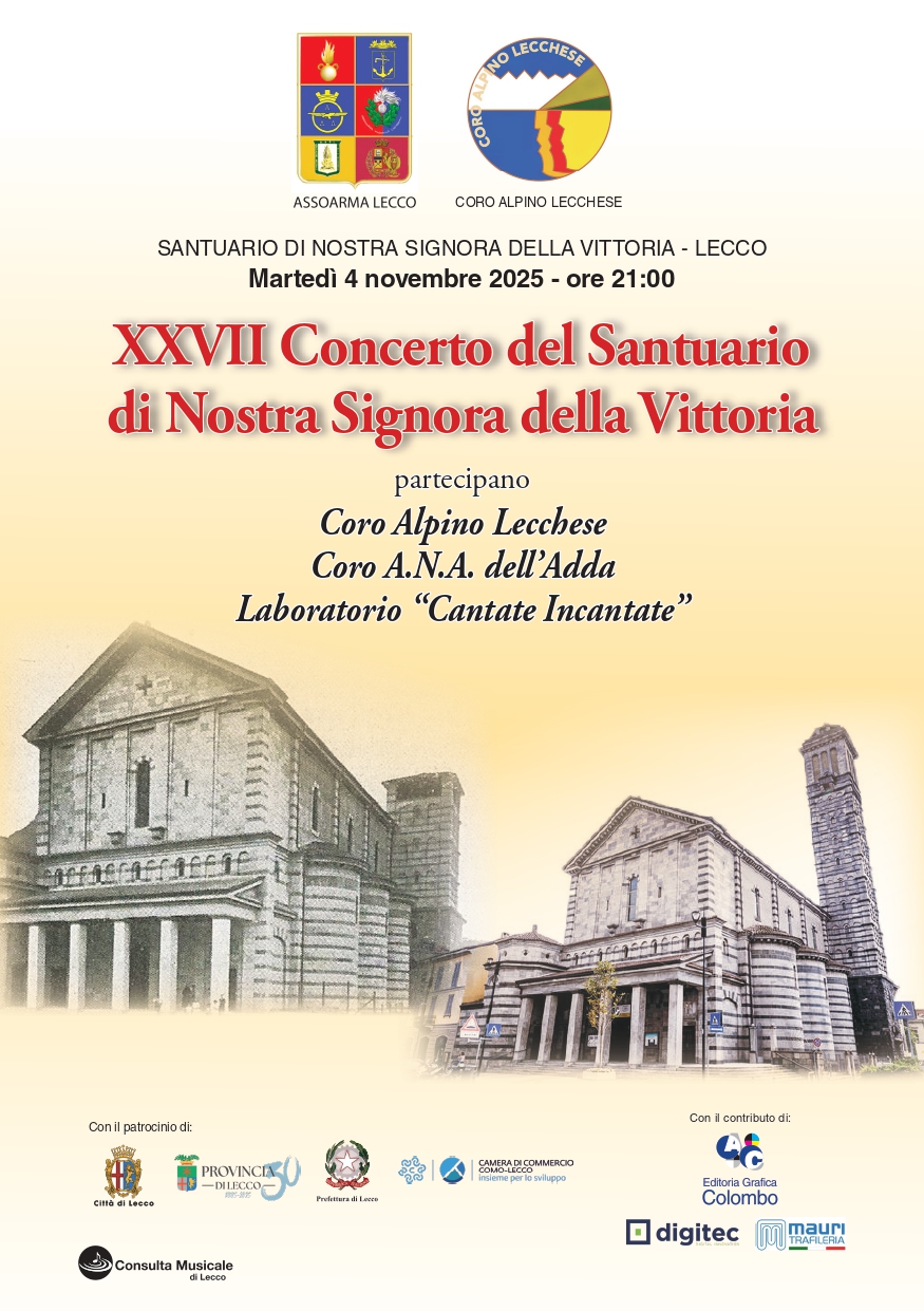 Martedì 4 Novembre alle 21.00, presso il Santuario della Vittoria di Lecco, si terrà il XXVII concerto del Santuario di nostra Signora della Vittoria.