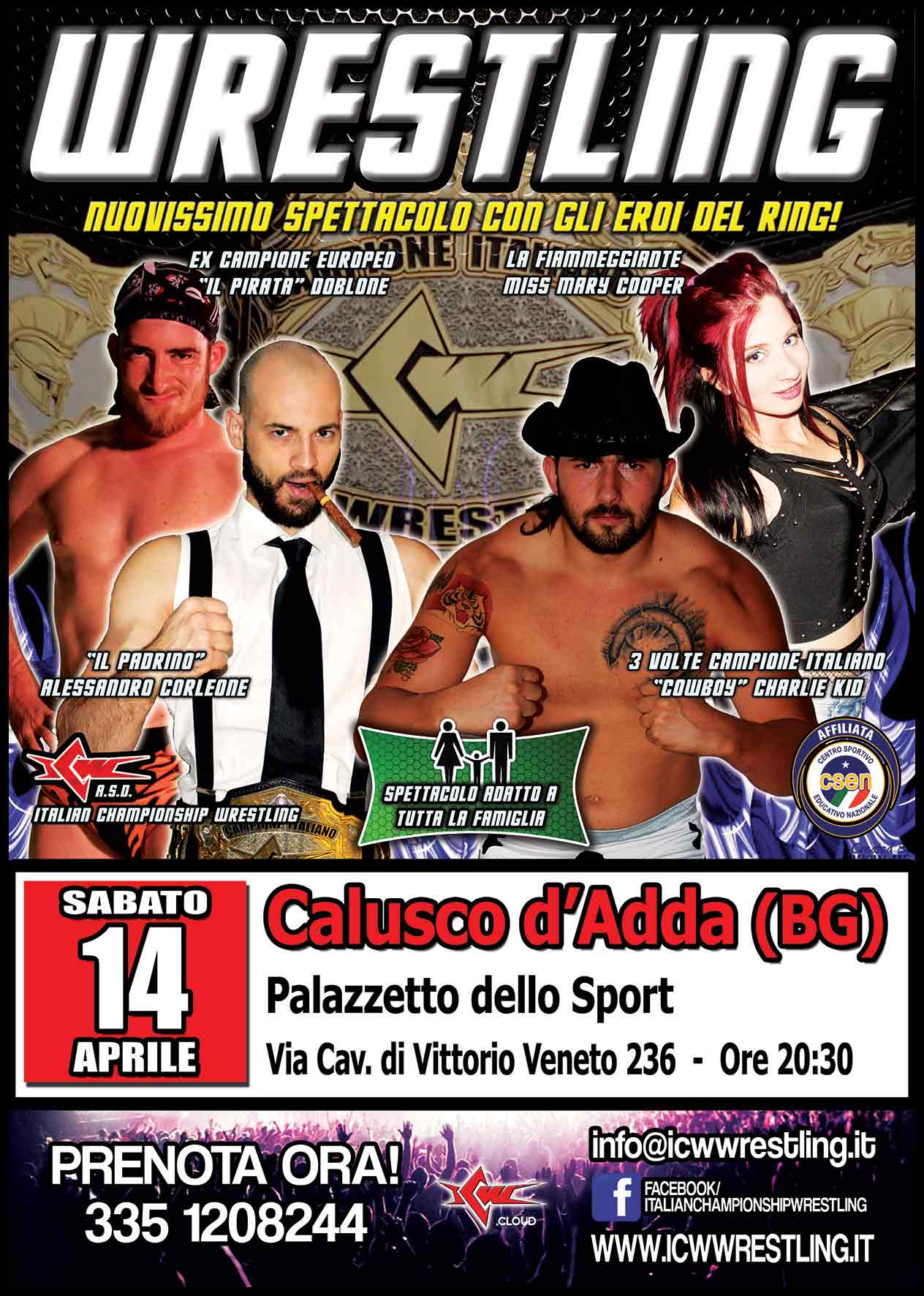 L’appuntamento con il vulcanico mondo del catch americano è quindi per questo sabato 14 aprile 2018 a Calusco d’Adda (BG) alle ore 20:30, presso il Palazzetto dello Sport in Cavalieri di Vittorio Veneto 236. I biglietti per la serata sono disponibili al prezzo speciale di 12 Euro per gli adulti e 8 Euro per i ragazzi fino a 12 anni. E’ previsto anche un biglietto famiglia scontato. Per maggiori informazioni è disponibile il numero 335-1208244 e il sito ufficiale della federazione all’indirizzo www.wrestlingitaliano.it.