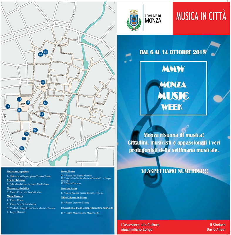 Così l’Amministrazione Comunale, che è uno dei soggetti promotori del Comitato Rina Sala Gallo, intende diffondere le note musicali in città, accogliendo i partecipanti al concorso e i grandi protagonisti della musica e dedicando un’intera settimana, dal 7 al 14 ottobre, al “Monza Music Week”.