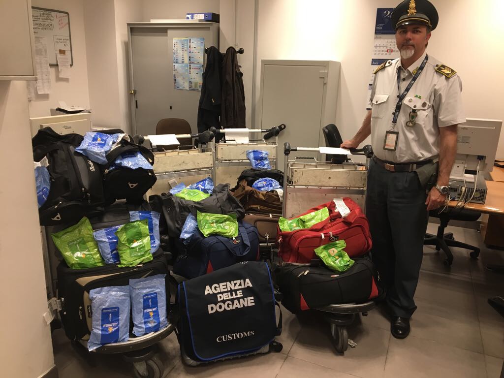 I sei viaggiatori, tutti giovani cittadini francesi di età compresa tra i 23 ed i 29 anni, provenivano da Abu Dhabi (Emirati Arabi Uniti) e dopo aver fatto scalo a Muscat (Oman) sono stati fermati mentre erano in procinto di uscire dagli spazi doganali con il loro ingente ed inconsueto carico. Non si tratta però di un caso isolato, se si tiene conto che da inizio anno sono stati fermati complessivamente 20 passeggeri, quasi tutti cittadini di nazionalità francese, disoccupati o studenti, che per poche centinaia di euro accettano di effettuare questi viaggi inconsapevoli del fatto che se fermati in Italia incorrono in una denuncia per tentato contrabbando di tabacchi lavorati esteri.