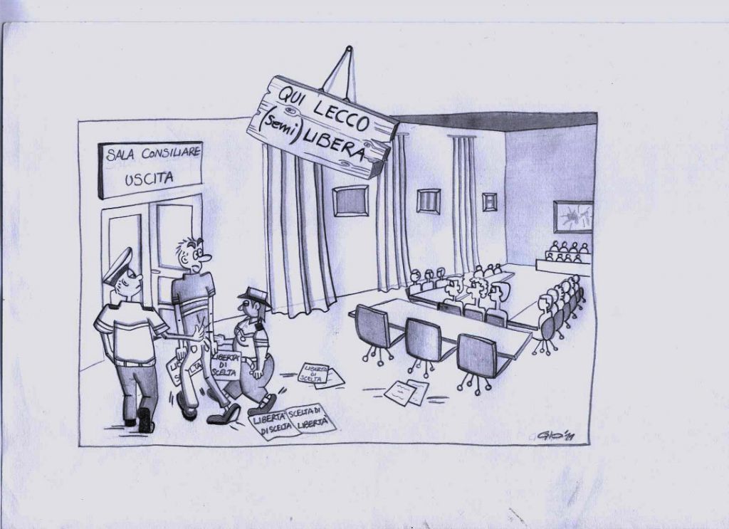 Puntuale come sempre, la vignetta del GIO-vedì di Giò questa volta punta i fari sul siparietto che ha caratterizzato il consiglio comunale di lunedì 25, con l’intervento di un paio di Agenti di Polizia Locale intervenuti per sedare la protesta delle associazioni Cellula Coscioni, Qui Lecco Libera e Renzo e Lucio. Tema: il registro per il testamento biologico.