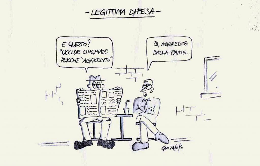 Non è passato inosservato, alla matita di Giò, il caso del cacciatore, pare, aggredito da un cinghiale in zona Montalbano sopra Lecco. Vicenda che si è conclusa con l’uccisione dell’animale giustificata dall’uomo come ‘legittima difesa’. Gio’ nella sua vignetta ha reinterpretato il tutto… non sara mai che abbia ragione lui?
