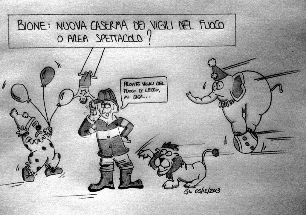 LECCO – La protesta dei Vigili del Fuoco, che chiedono a gran voce una nuova caserma, e l’intenzione del Comune di Lecco di trasformare in area per spettacoli il terreno del Bione destinato dal Demanio alla realizzazione della nuova stazione dei pompieri ha ispirato la matita di Gio’.