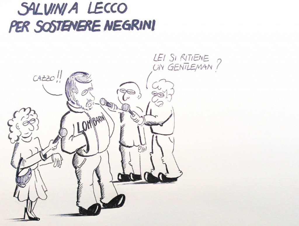 LECCO – Le reazione di Matteo Salvini, segretario della Lega Nord, in visita a Lecco per sostenere la candidatura di Alberto Negrini alla poltrona di sindaco nei confronti di un gruppetto di contestatori, ai quali ha dato degli “sfigati” per poi salutarli con il dito medio alzato (vedi articolo), non ha mancato di suscitare la verve satirica di Giò in questa nuova vignetta.