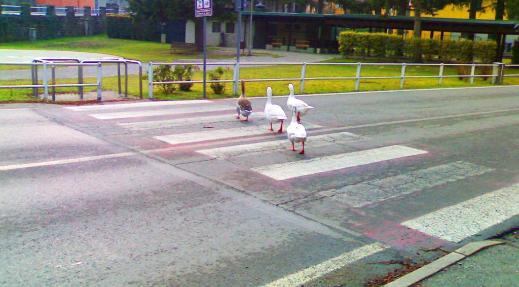 EUPILIO – Saranno pure oche, ma sanno benissimo come si attraversa la strada. Per lo meno quelle di Eupilio (CO), che di ritorno dalla spiaggetta del lago del Segrino, oltrepassano l’arteria stradale di via Panigatti, utilizzando le strisce pedonali.