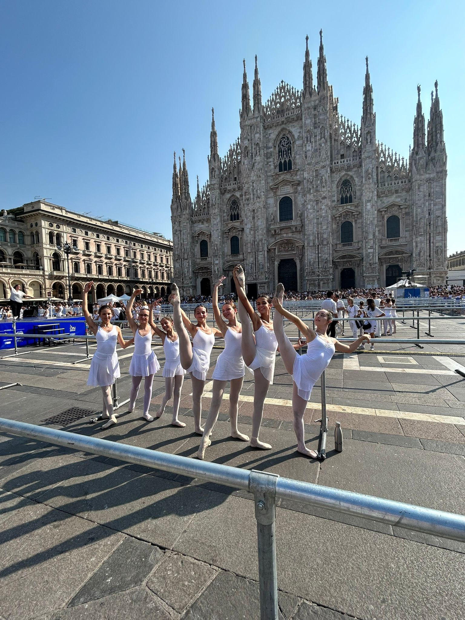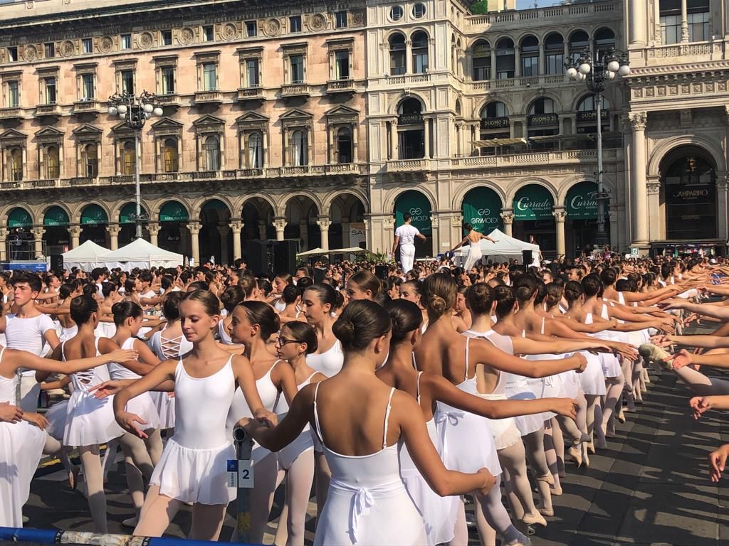 Piccoli e grandi danzatori insieme, hanno atteso l’arrivo di tutti i loro compagni/e ed hanno rispettato i tempi televisivi, rimanendo al loro posto dalle 8 alle 9,30 del mattino, in piedi davanti alla sbarra assegnata a riscaldarsi. Nell’aria si udivano soltanto i bisbìgli dei ragazzi, i piccoli passi striscianti sulle pietre della piazza del Duomo e qualche brusio del pubblico curioso che si accalcava per guadagnare il posto migliore per la visione. Il candore dei body bianchi, le guglie del duomo che svettano nel cielo azzurro di una domenica di settembre hanno creato un’emozione molto suggestiva ed emozionante.