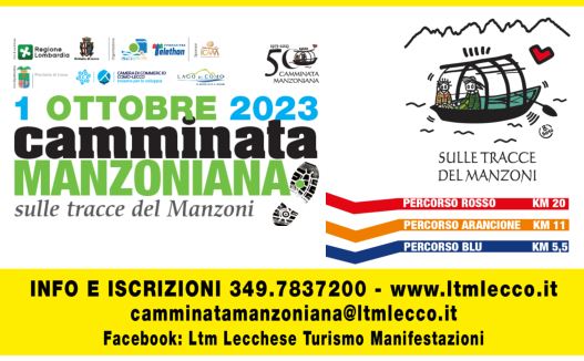 La data da segnare in rosso sull’agenda è quella del 1° ottobre, quando “sulle tracce del Manzoni” come recita il claim della kermesse manzoniana, si darà il via alla camminata che, come sempre, prevede tre percorsi: quello Rosso da 20 chilometri, quello Giallo da 11 e quello Verde da 5,5 chilometri.