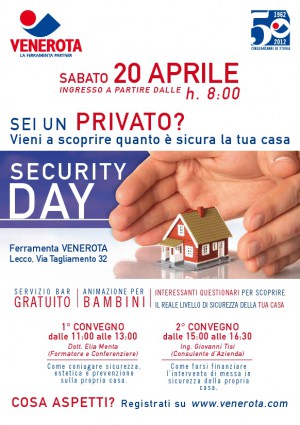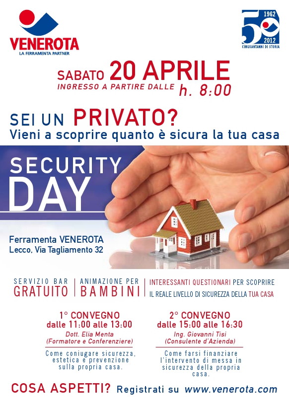 Sarà infatti la Sicurezza (nelle case, negli uffici e nelle aziende) il tema centrale dell’evento che si terrà domani, sabato 20 aprile, dalle 8.00 alle 18.00, presso la nota ed accogliente sede della Ferramenta VENEROTA a Lecco in via Tagliamento 32.