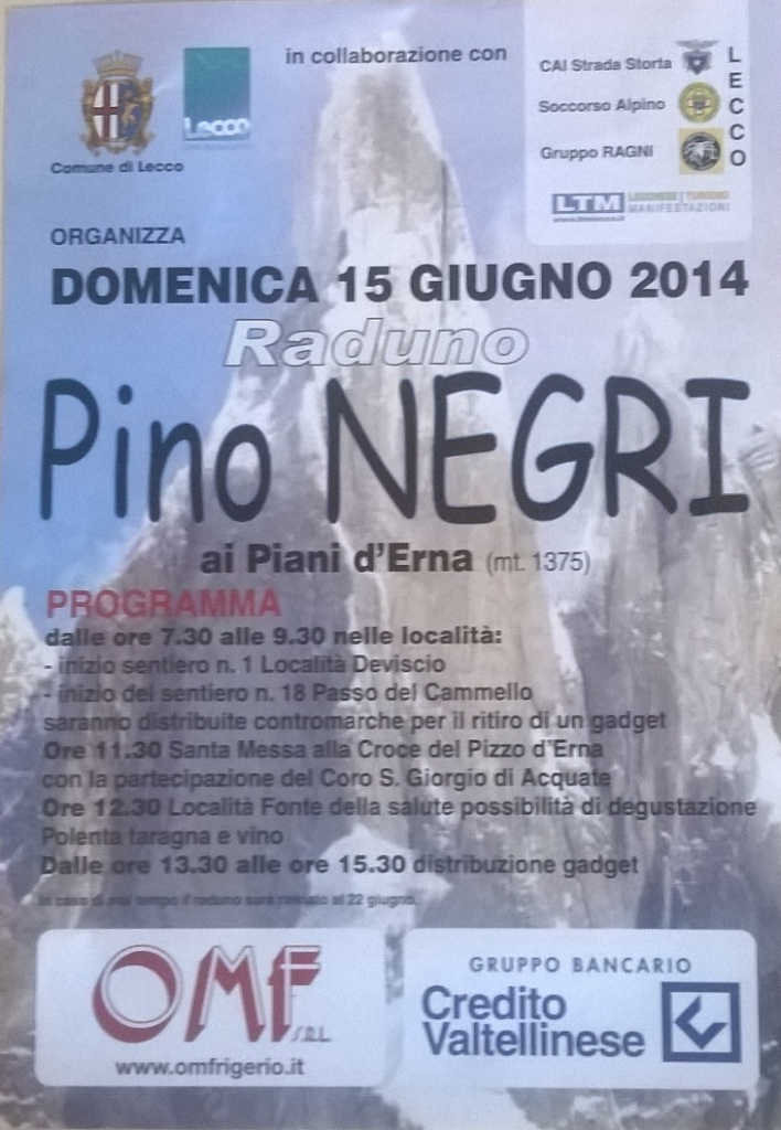 LECCO – Come tradizione, ogni terza domenica di Giugno (quest’anno il 15) si terrà il Raduno Pino Negri, organizzato dal CAI Strada Storta, Soccorso Alpino, Gruppo Ragni e LTM Lecchese Turismo manifestazioni con l’appoggio del Comune di Lecco.