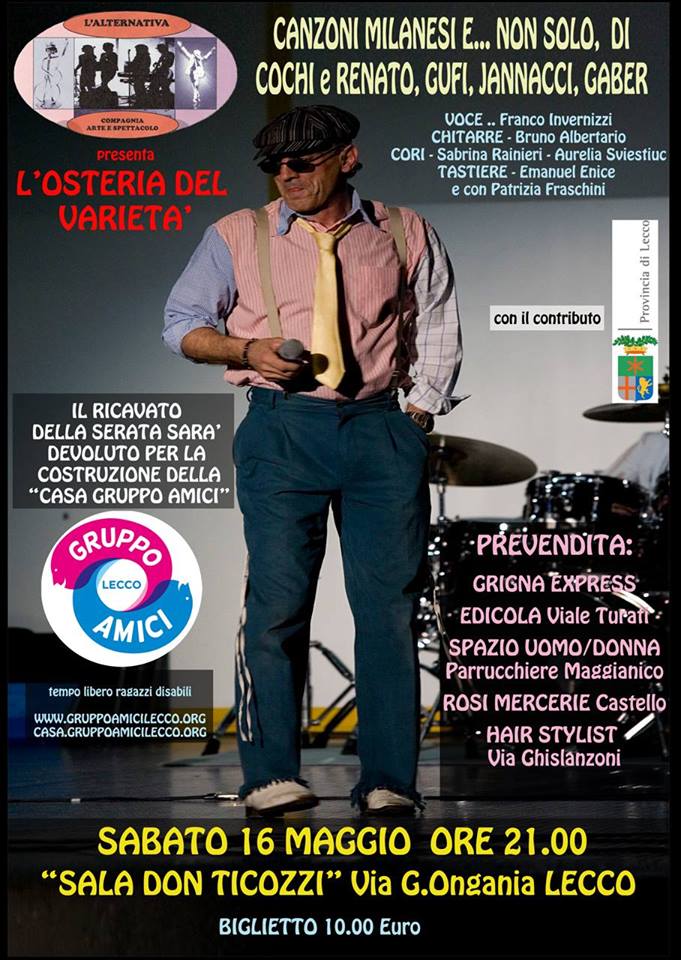 LECCO – Il gruppo amici Lecco, in collaborazione con la compagnia teatrale “l’alternativa” e con il contributo della provincia di Lecco, organizza uno spettacolo teatrale dal titolo “L’osteria del varietà” con lo scopo di raccogliere fondi per la costruzione della “Casa Gruppo Amici”.