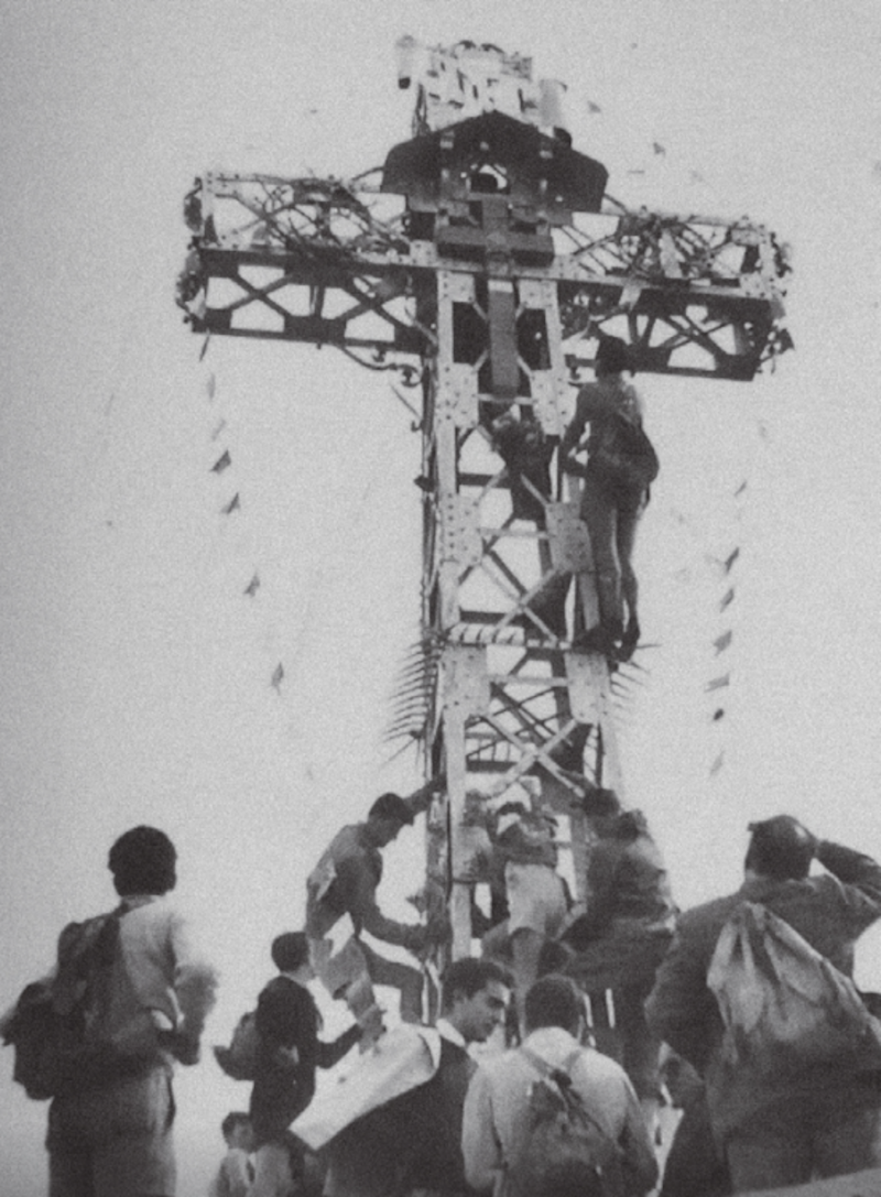 I lavori di posa, iniziati il 5 giugno 1925 sotto la direzione del capomastro Maiocchi e dell’ingegner Terruggia, avevano richiesto una massicciata di 12 quintali di cemento per ancorare la struttura alla roccia. La rivista SEL dell’agosto 1925 descriveva con dovizia di particolari la costruzione: “La base larga, bene amalgamata alla roccia mediante getti di cemento, con zanche fisse nella montagna… La Capanna Daina (oggi rifugio Luigi Azzoni, ndr) ospita gli artefici ed è trasformata in cantiere, ed ivi sono depositati cemento, calce, ferramenta, ghiaia e tutto quanto i muli, fedelissimi compagni di fatica dei montanari di Morterone, trasportano fino alla vetta. Emergono già i tronconi della Croce e l’altare orientato verso est ha per sfondo il superbo scenario delle Alpi Orobiche e l’immacolato candore delle Retiche, appiccicate sul cobalto della volta celeste”.