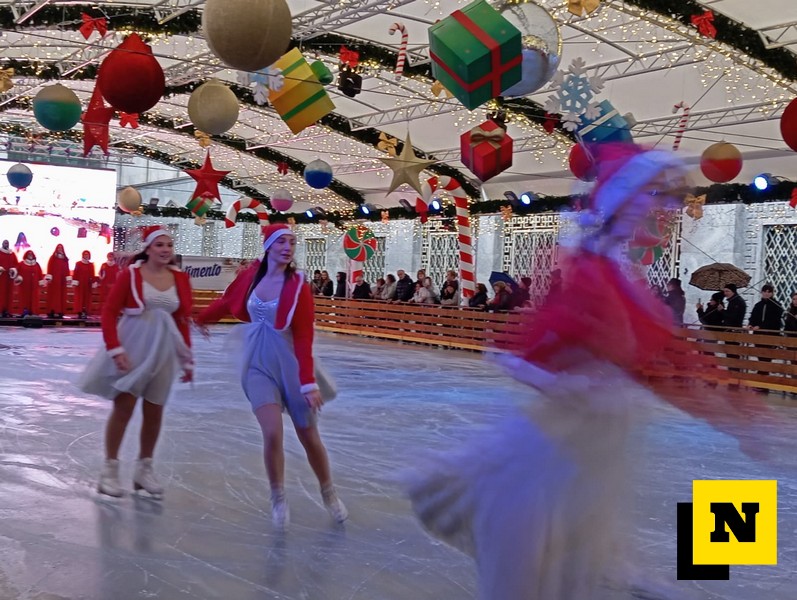 Neppure la pioggia ha guastato l’atmosfera, complice anche la copertura della struttura. All’improvviso, come in una fiaba, sono entrate in scena le pattinatrici della Sk8 Crew. Volteggi, salti, linee perfette e sincronizzate. Il tutto accompagnato dalle voci profonde e avvolgenti della Free Gospel Band che ha intonato melodie natalizie portando in anticipo nella piazza un respiro di festa.