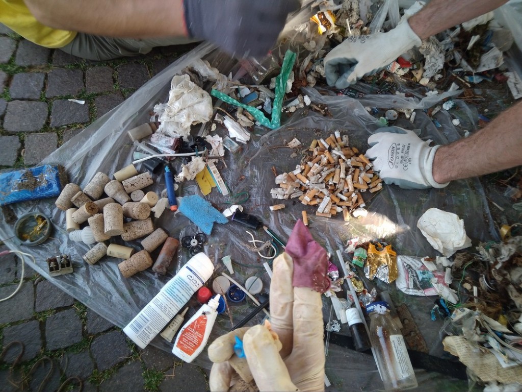 In circa un’ora sono stati ritrovati per lo più oggetti di plastica con più di 500 mozziconi di sigaretta, 70 incarti di caramelle e merendine, più di 80 singoli pezzi di polistirolo (molti di più erano così frammentati da risultare irrecuperabili), almeno 100 frammenti plastici di varia natura, involucri plastici dei pacchetti di sigarette, stoviglie di plastica, cannucce, escrementi di cane nel sacchetto, fili da pesca e bastoncini dei cotton-fioc.
