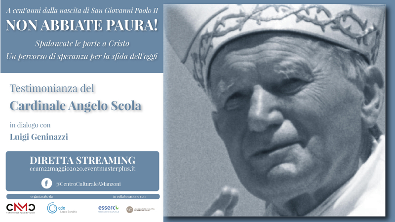 In occasione dell’anniversario della nascita di Karol Wojtyla, il Centro Culturale Alessandro Manzoni di Lecco e la Compagna delle Opere Lecco Sondrio, in collaborazione con l’Associazione Italiana Centri Culturali e con l’associazione Esserci, propongono un incontro di riflessione sulla sua figura e il suo insegnamento con uno sguardo puntato anche a questo delicatissimo momento segnato dagli effetti umani e sociali della pandemia di Coronavirus.