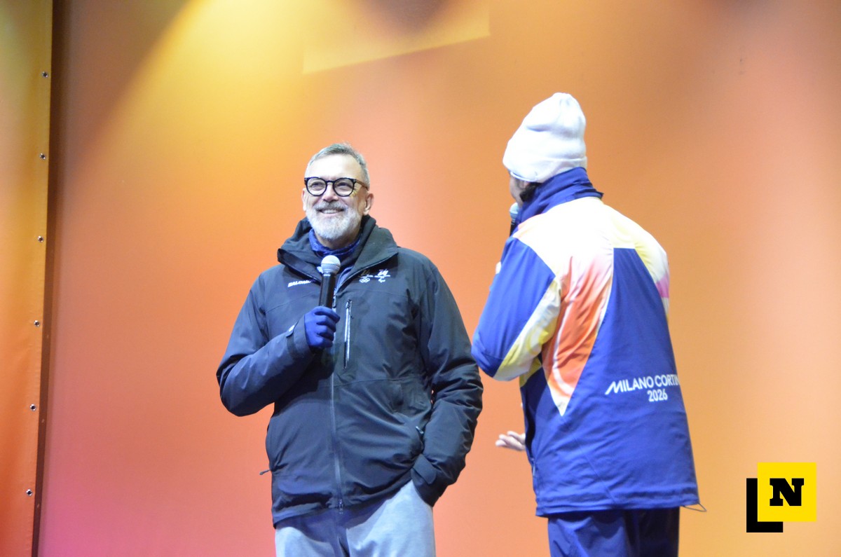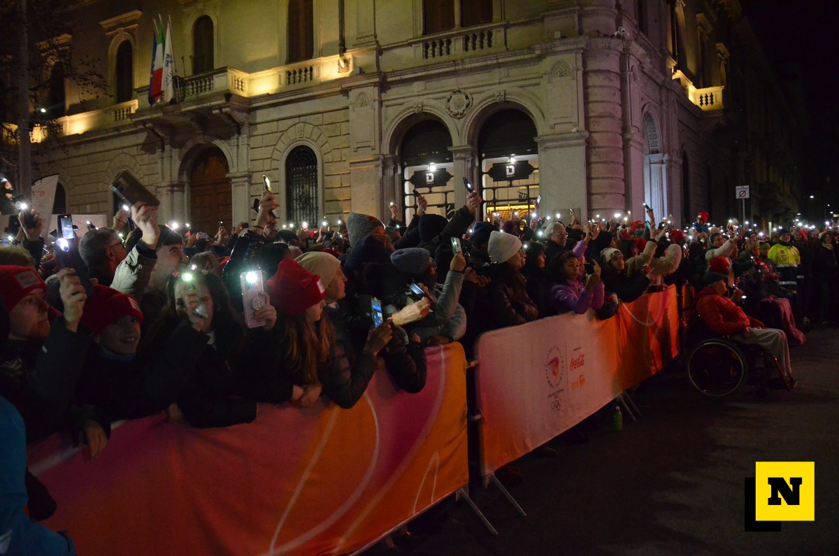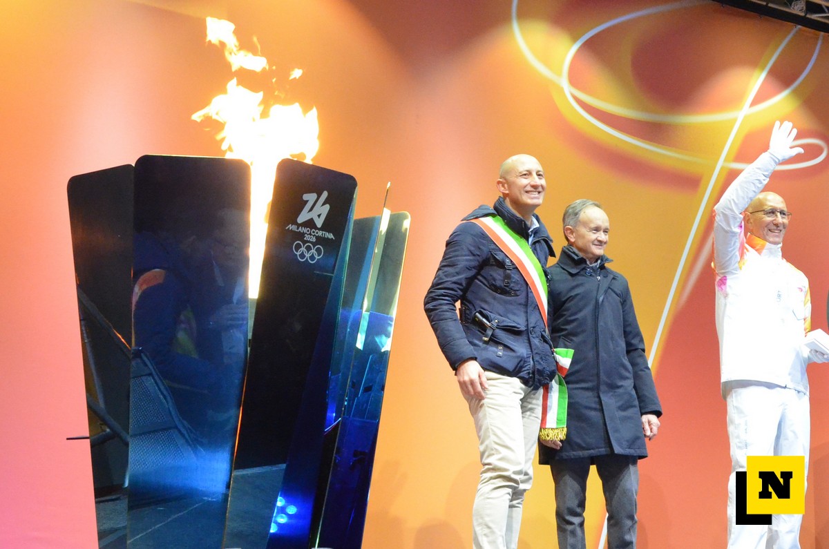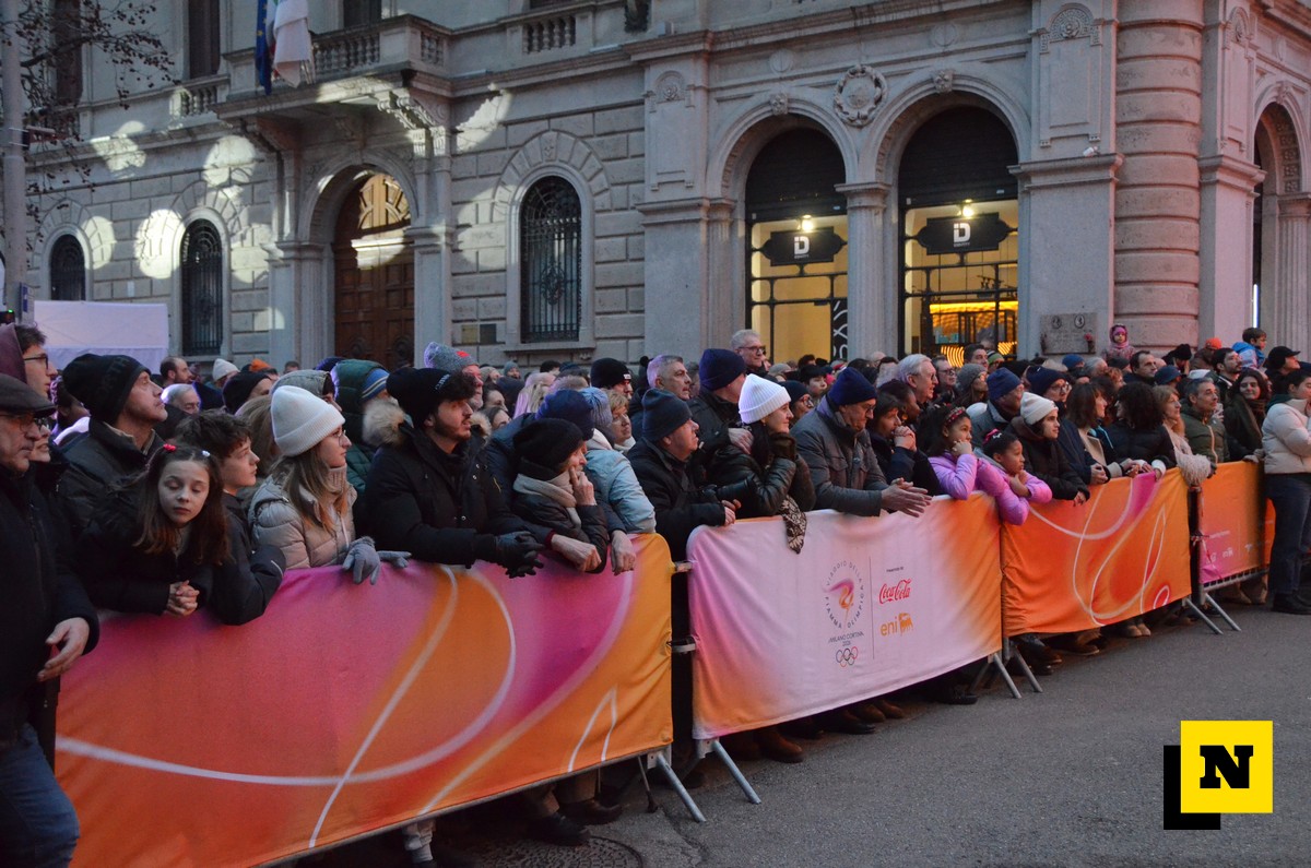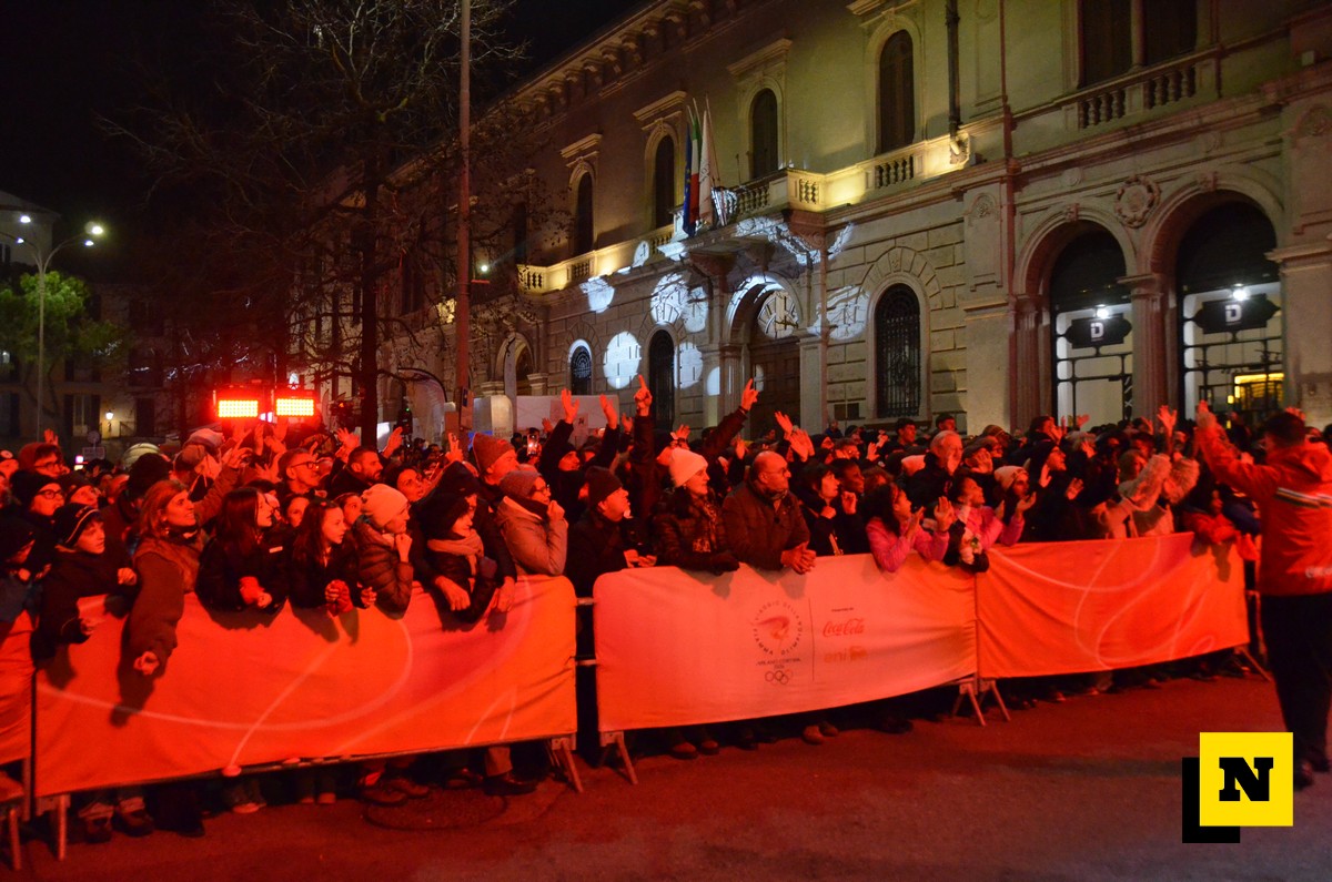 La Fiamma Olimpica – dopo aver attraversato Lecco – è arrivata al Villaggio Olimpico. Negli ultimi metri, ha percorso via Cavour, attraversato il corridoio creato tra la folla di piazza Garibaldi prima di salire sul palco, fino al braciere.
