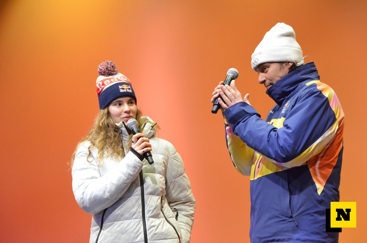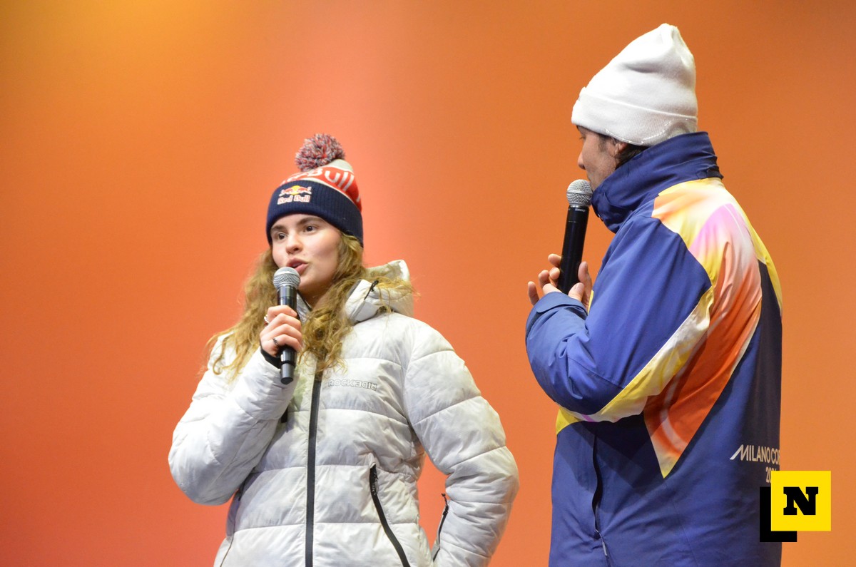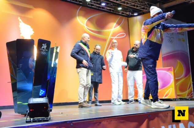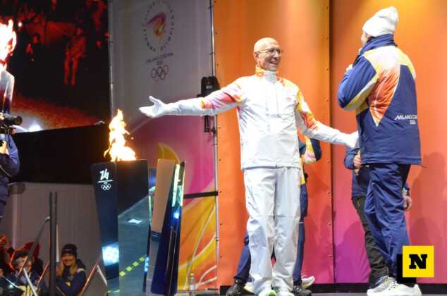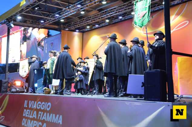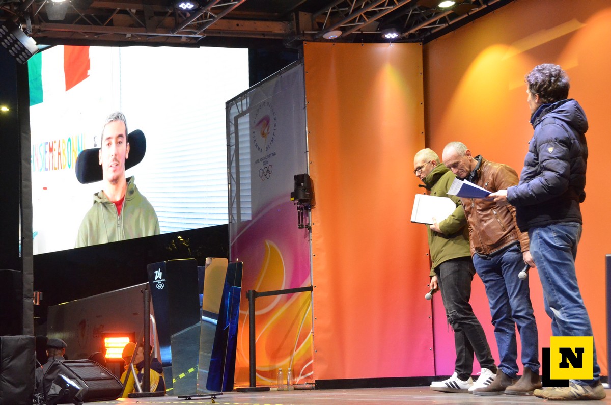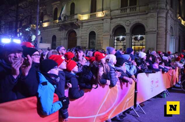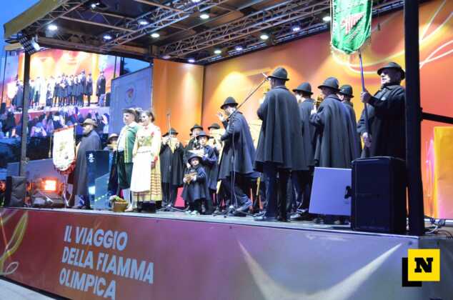 La Fiamma Olimpica – dopo aver attraversato Lecco – è arrivata al Villaggio Olimpico. Negli ultimi metri, ha percorso via Cavour, attraversato il corridoio creato tra la folla di piazza Garibaldi prima di salire sul palco, fino al braciere.