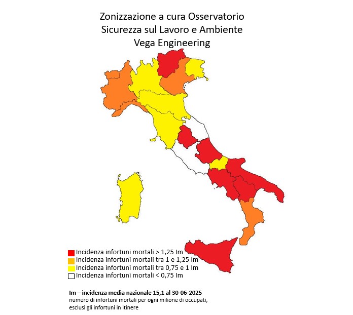 A finire in zona rossa a giugno 2025, con un’incidenza superiore a +25% rispetto alla media nazionale (Im=Indice incidenza medio, pari a 15,1 morti sul lavoro ogni milione di lavoratori), sono: Basilicata, Umbria, Trentino-Alto Adige, Sicilia, Puglia, Abruzzo e Campania. In zona arancione: Calabria, Valle d’Aosta, Veneto, Liguria e Piemonte. In zona gialla: Toscana, Friuli-Venezia Giulia, Marche, Lombardia, Sardegna ed Emilia-Romagna. In zona bianca: Molise e Lazio.
