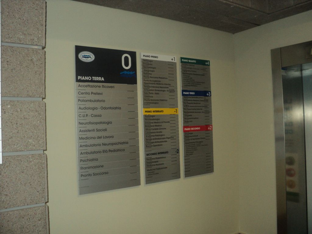 Una ventina , infatti, i segnali direzionali, cioè i cartelli posti lungo la struttura ospedaliera che accompagnano i visitatori o i pazienti da un reparto all’altro guidandoli anche agli uffici amministrativi e alla Direzione Aziendale.
