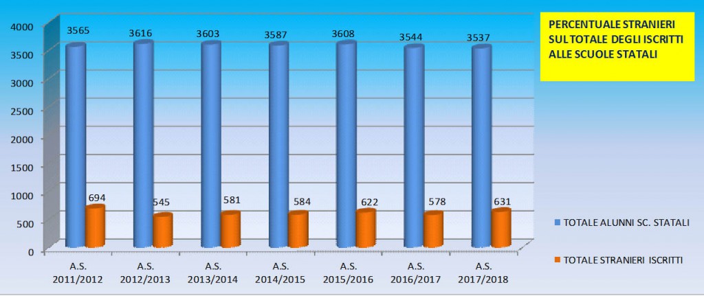 I numeri degli alunni stranieri sono altalenanti, in quanto la mobilità delle famiglie extra Unione europea è alta. Gli alunni stranieri che frequentano la scuola dell’obbligo sono per la quasi totalità iscritti nelle scuole statali, dove rappresentano circa il 17% degli alunni (1 su 6).