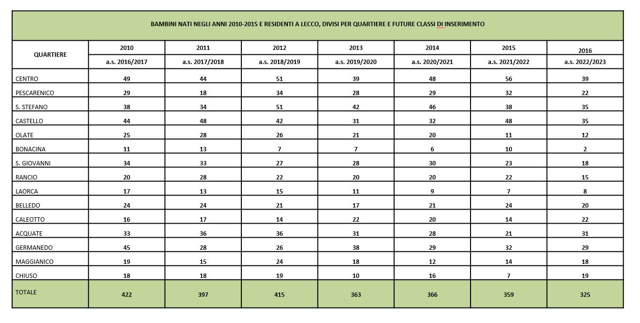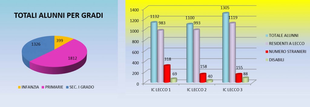 Il dato emerge dal dossier preparato dall’Ufficio Istruzione del Comune di Lecco. “Si tratta di uno strumento demografico scientifico che l’ufficio aggiornerà di anno in anno, mettendolo a disposizione degli amministratori e di tutta la cittadinanza. Nel corso degli anni si completerà con l’aggiunta dell’ “anagrafe degli edifici scolastici” secondo le linee del portale ministeriale recentemente istituito dalla “Buona scuola”, e con i costi di gestione dell’intero sistema dell’istruzione” ha spiegato l’assessore Salvatore Rizzolino.