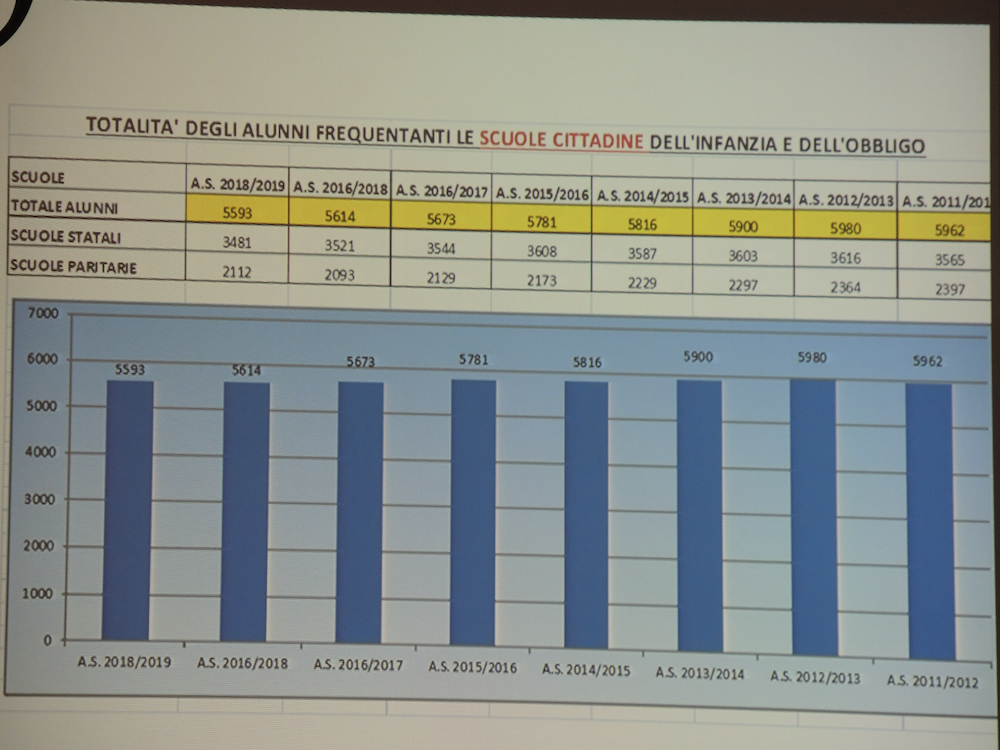 Analizzando i dati degli iscritti nelle scuole comunali cittadine si osserva che dall’anno scolastico 2011/2012 a quello che si è aperto proprio questa settimana gli alunni sono diminuiti di 369 unità, pari a circa 15 classi (conteggiando una media di 25 alunni per classe). Solo rispetto alle iscrizioni dell’anno scolastico 2017/2018, gli iscritti sono diminuiti di 21 unità, passando da 5.614 a 5.593. “Questa diminuzione – ha osservato l’assessore – si registra soprattutto nelle scuole statali (-40 iscritti), mentre le paritarie hanno guadagnato 19 iscritti, in netta controtendenza rispetto all’ultimo triennio”.