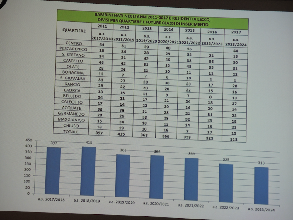 A Palazzo Bovara sono stati così presentati i risultati dell’analisi della demografia scolastica lecchese, strumento introdotto nel Dup a partire dallo scorso anno. I dati degli iscritti dall’anno scolastico 2011/2012 all’attuale 2028/2019, hanno evidenziato una sostanziale e costante diminuzione della popolazione scolastica, dalla scuola dell’infanzia alle secondarie di primo grado (scuole medie, ndr), in particolare modo per quanto riguarda le scuole statali.