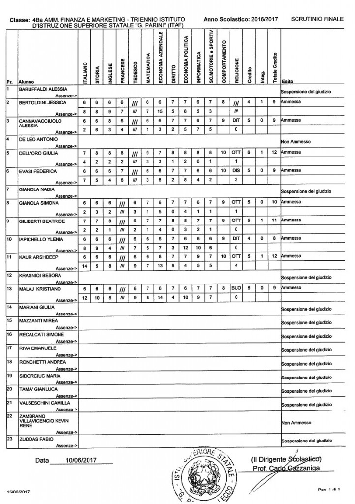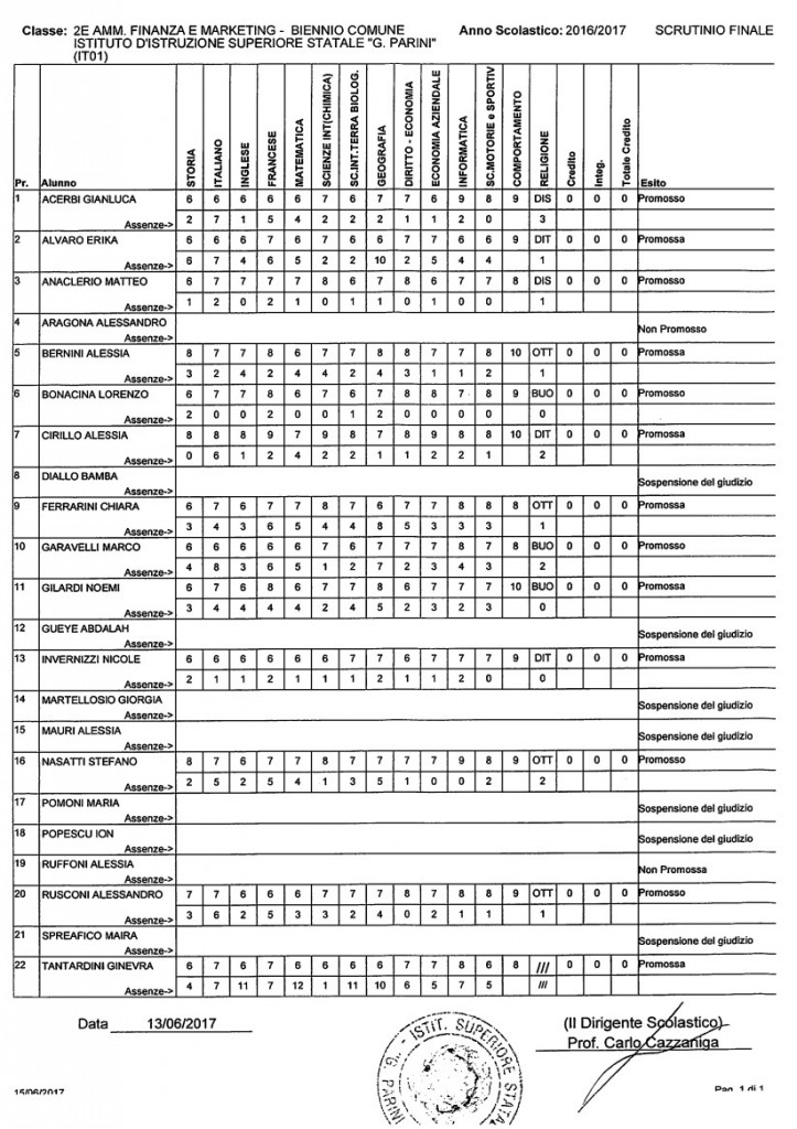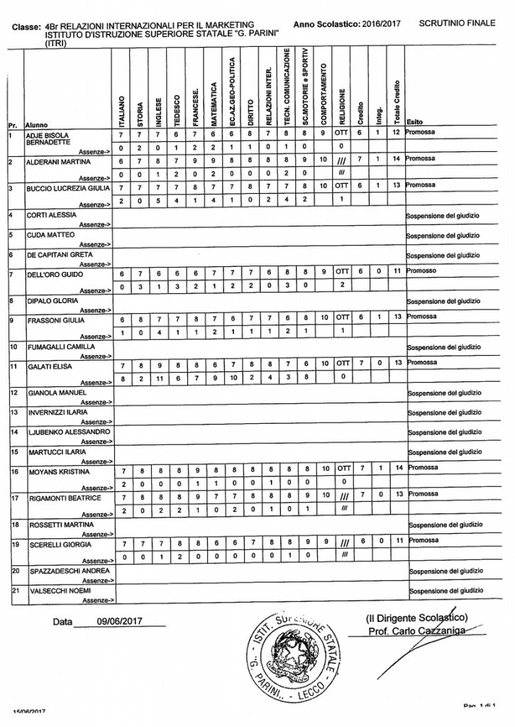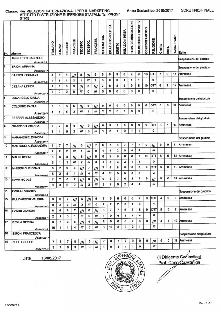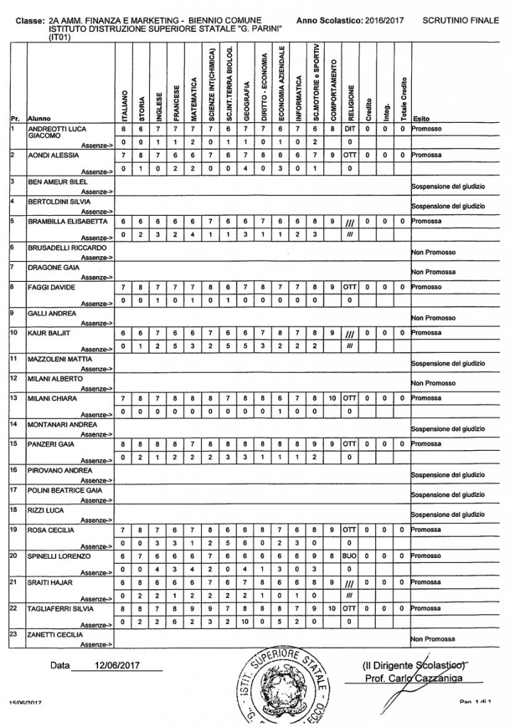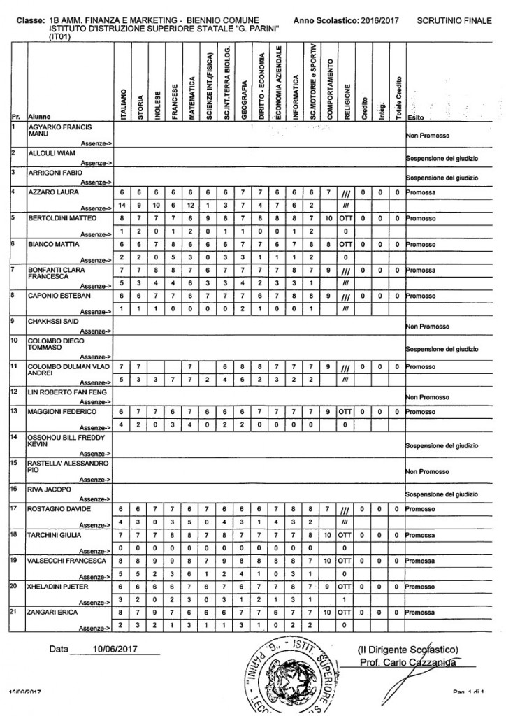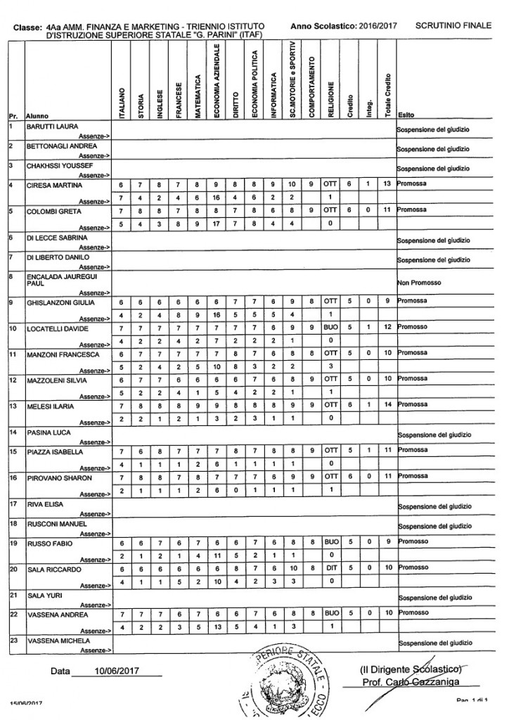 LECCO – Terminati gli scrutini anche all’Istituto Parini dove sono stati esposti tutti i quadri con i voti di fine anno. Li pubblichiamo di seguito:
