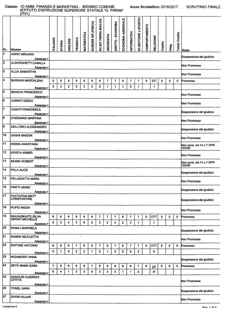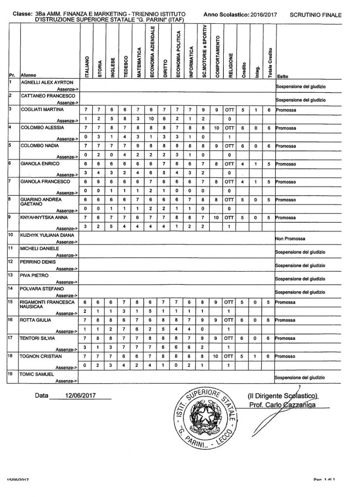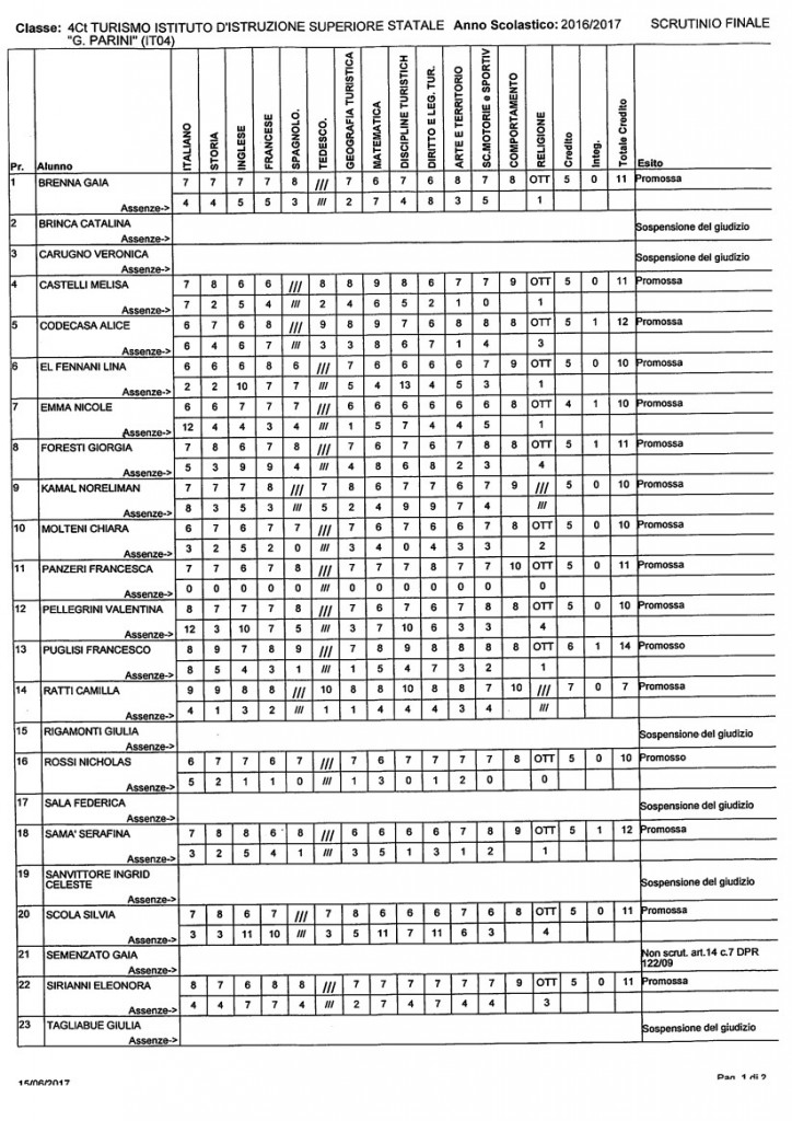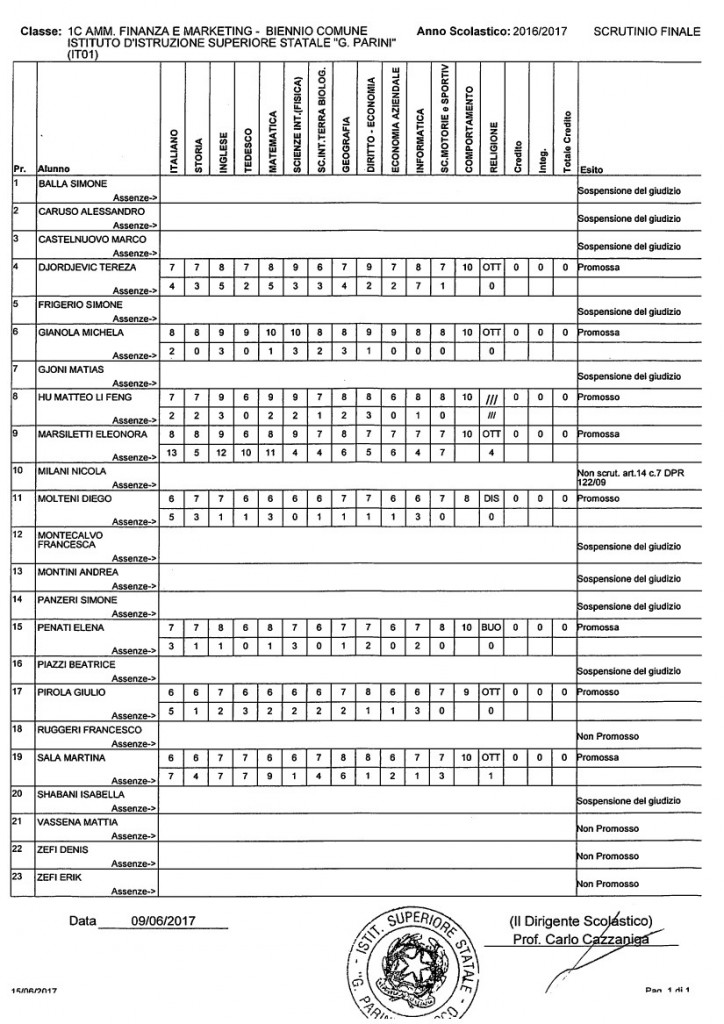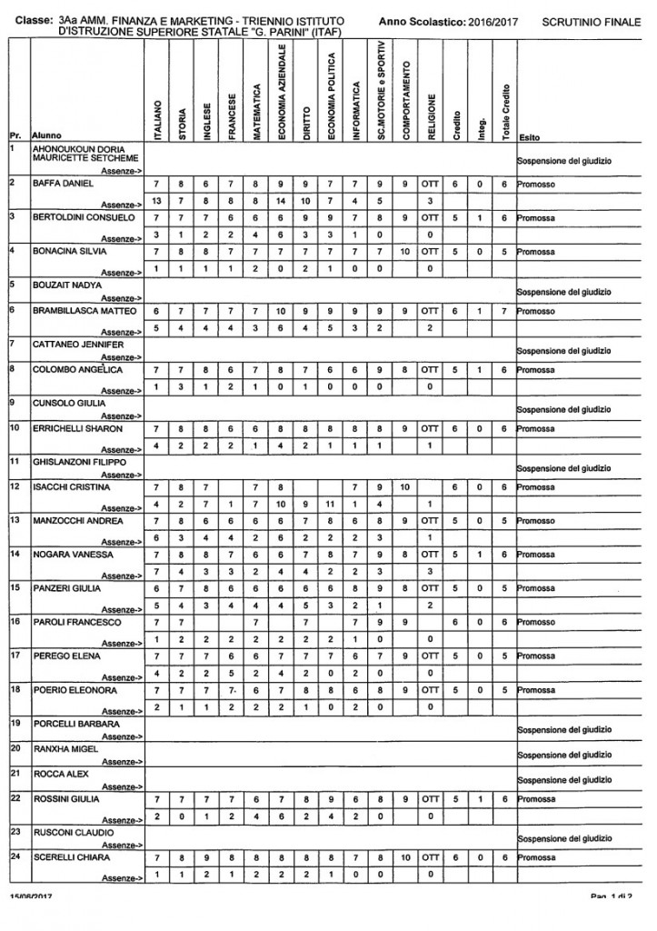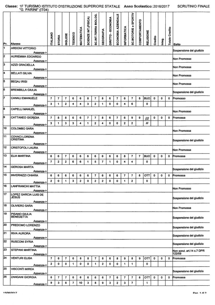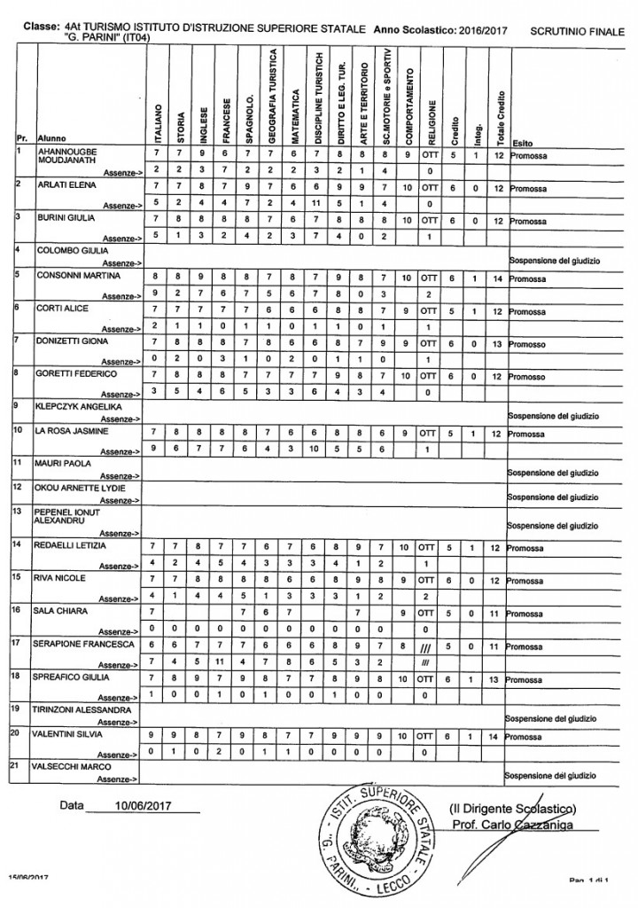 LECCO – Terminati gli scrutini anche all’Istituto Parini dove sono stati esposti tutti i quadri con i voti di fine anno. Li pubblichiamo di seguito: